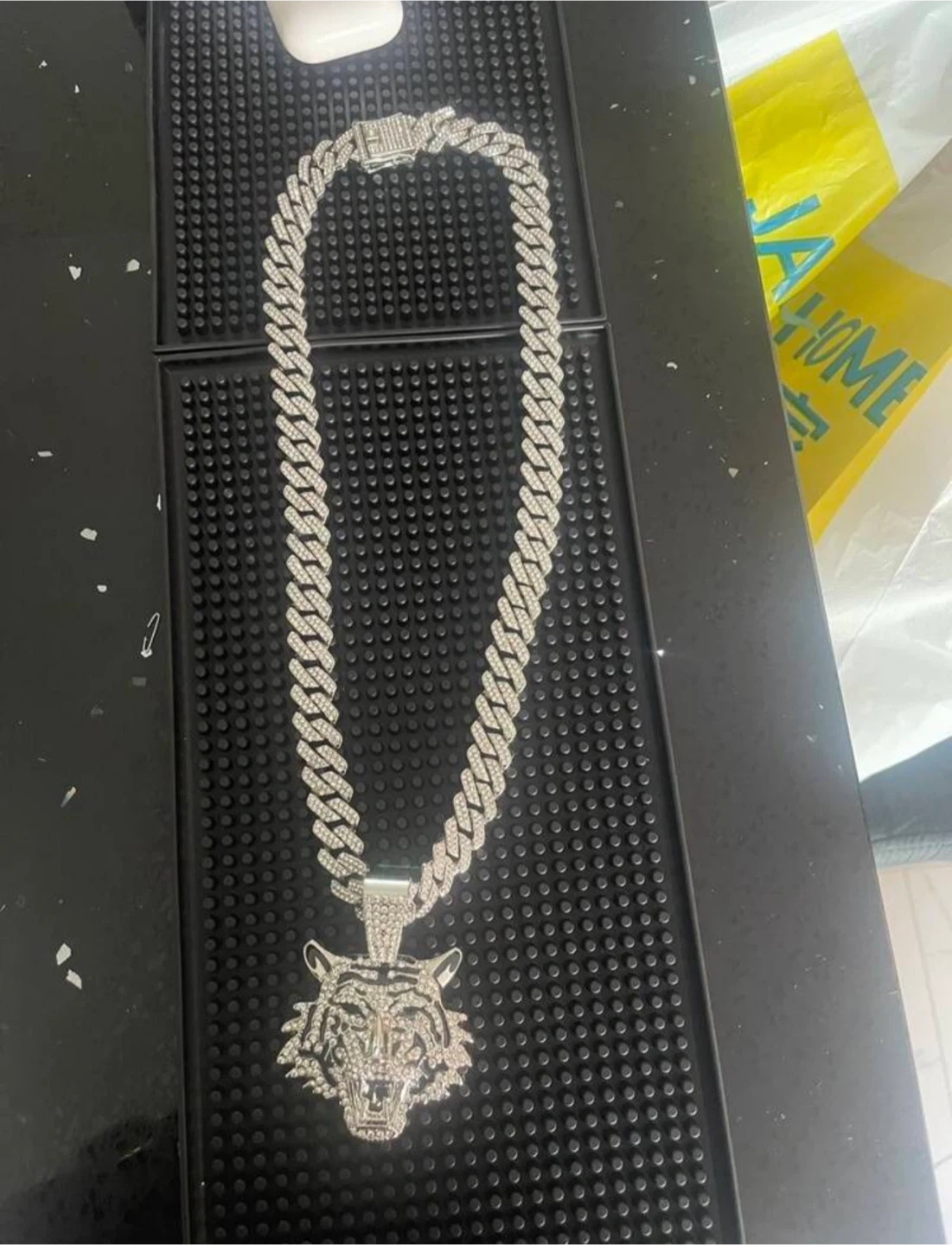 This statement necklace features a fully iced-out tiger head pendant and a Cuban link chain. The pendant measures 5.5cm/1.96inch, and the chain is 50cm/19.68 inches long. It's crafted with sparkling rhinestones for a dazzling look!
