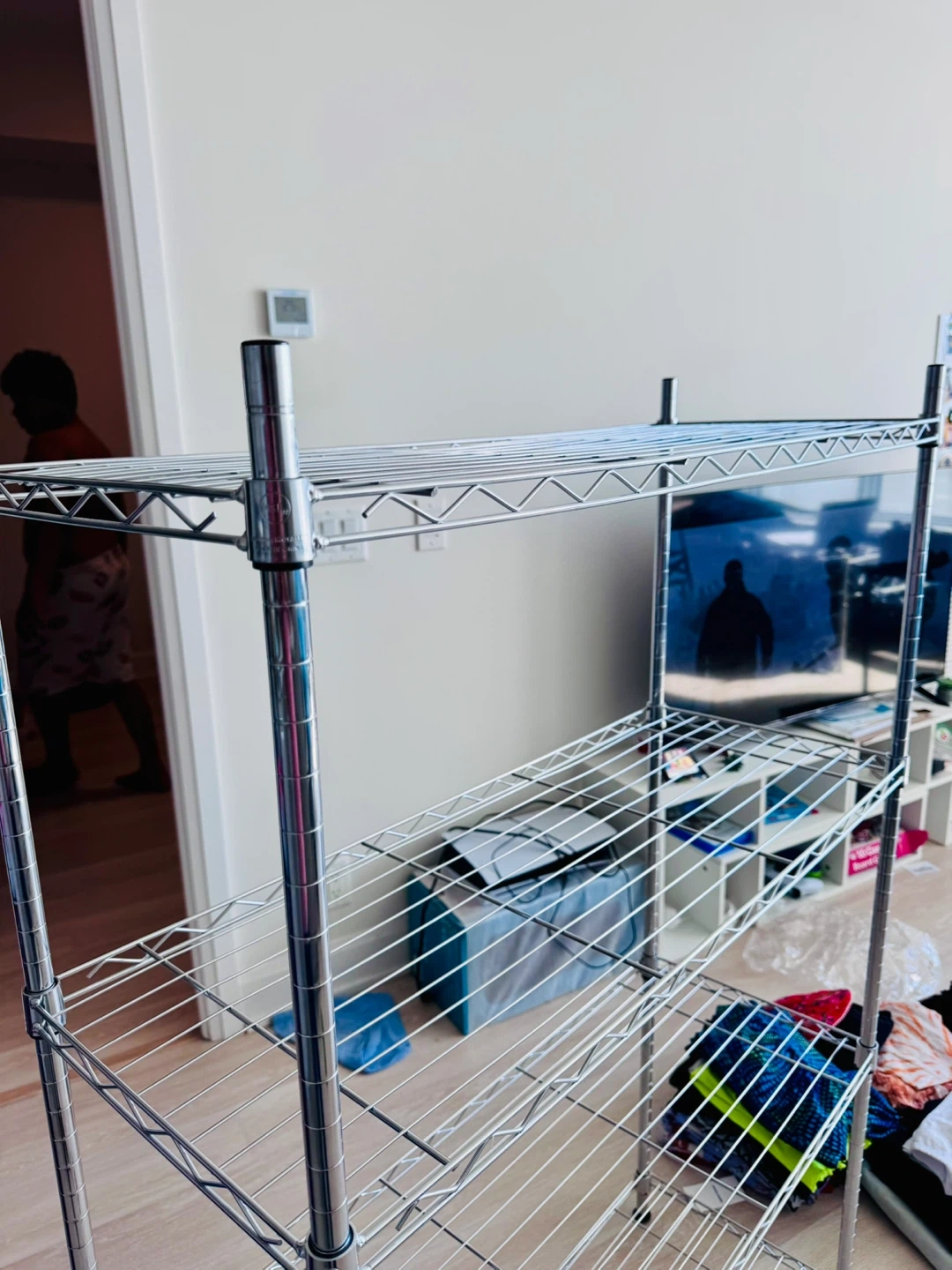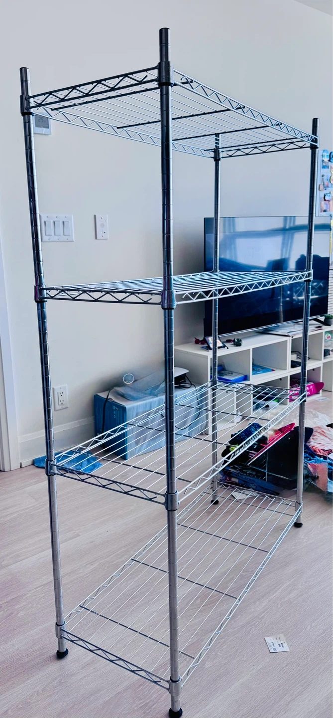 Sturdy metal wire shelving unit in excellent condition. Perfect for organizing storage in the kitchen, garage, laundry room, or basement.