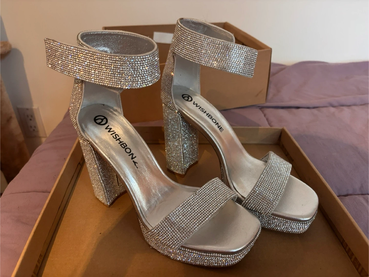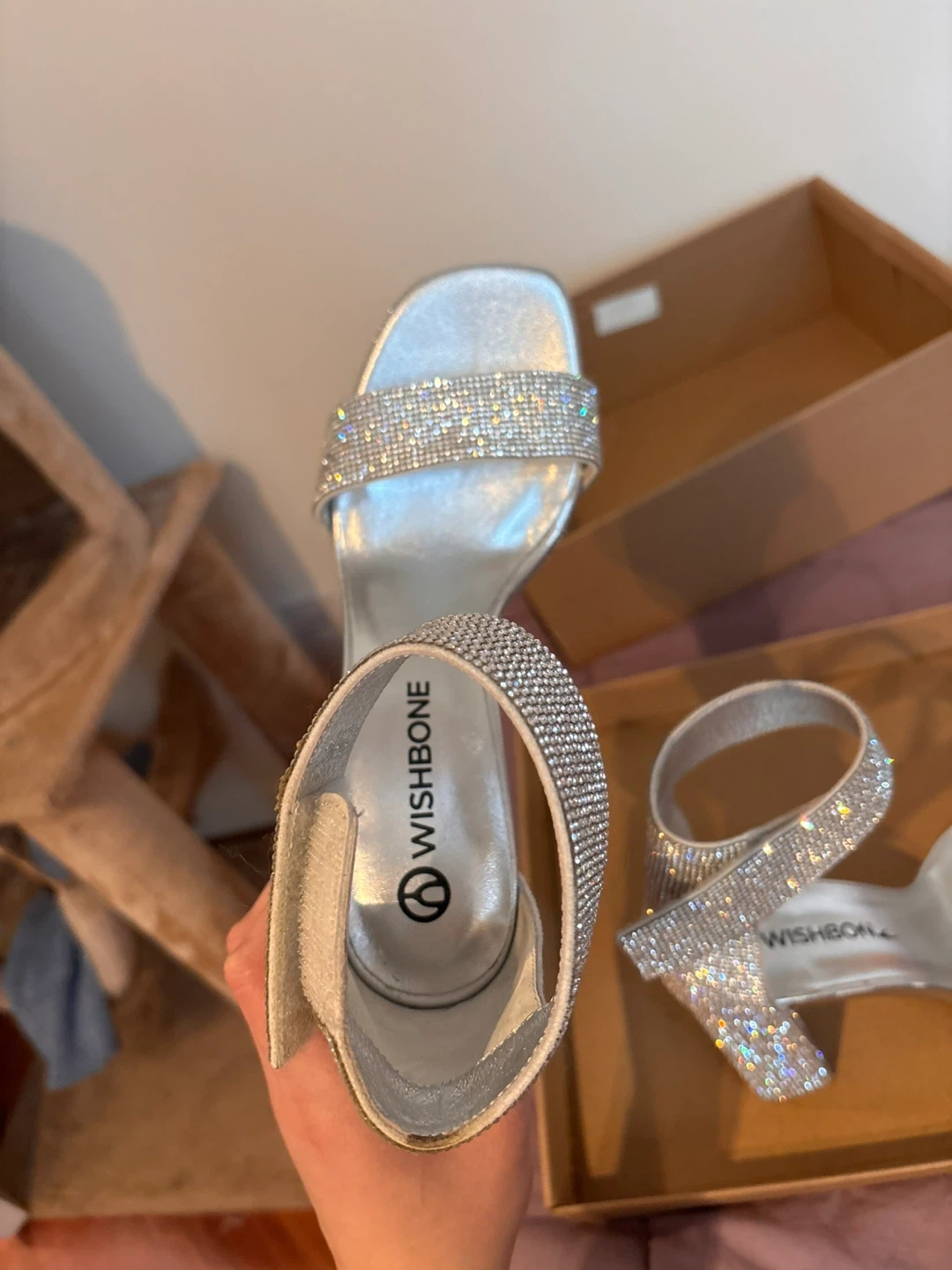 Selling my Gia Crystal Heels in silver rhinestone — super sparkly and perfect for prom, grad, weddings, and formal events. They seriously elevate any dress and look amazing in photos.