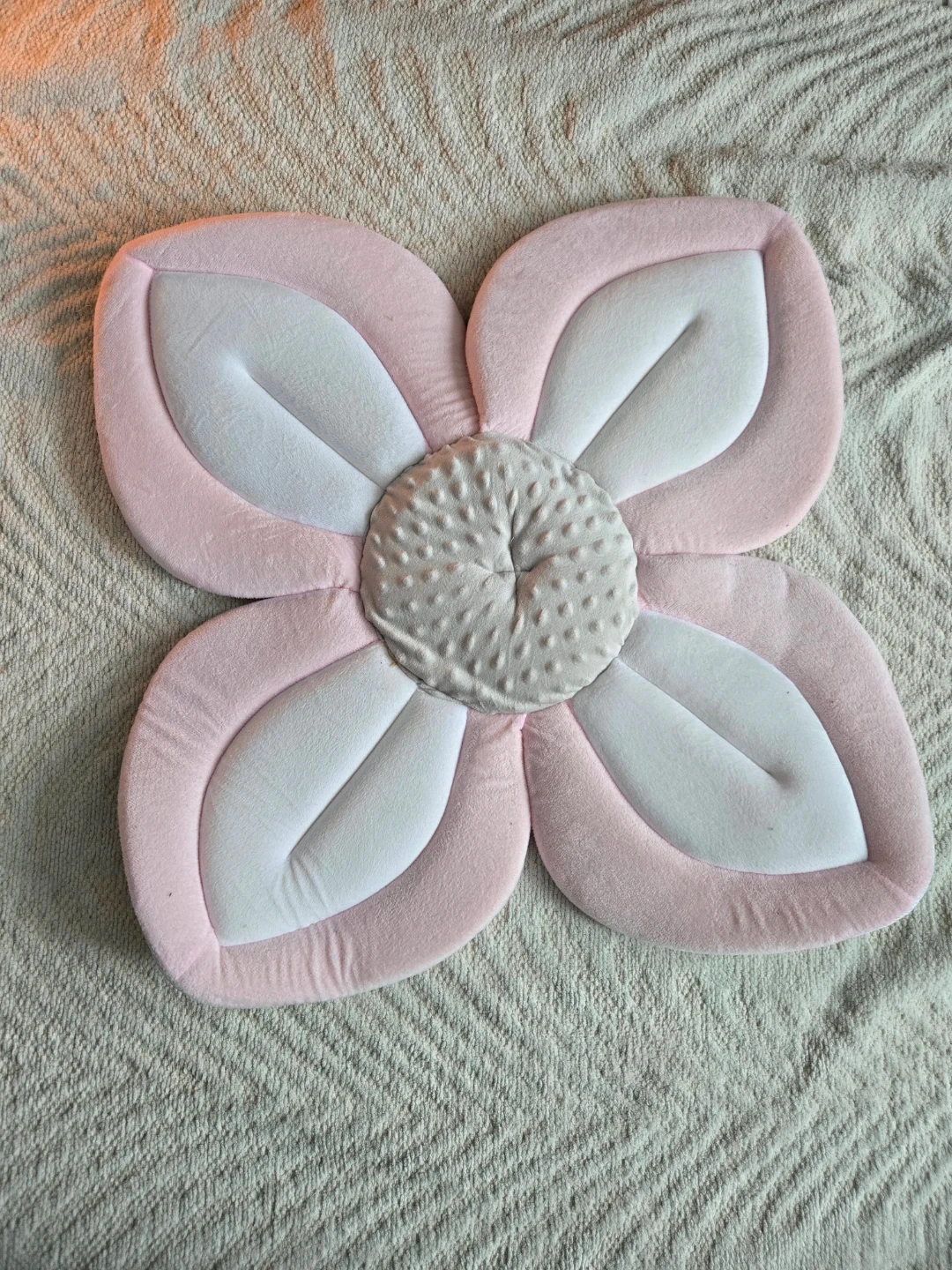 This soft bath mat is shaped like a flower, with pink and white petals. Its plush material helps cushion your baby during bath time & it dries easily. Used once. Great for making bath time comfy and safe!