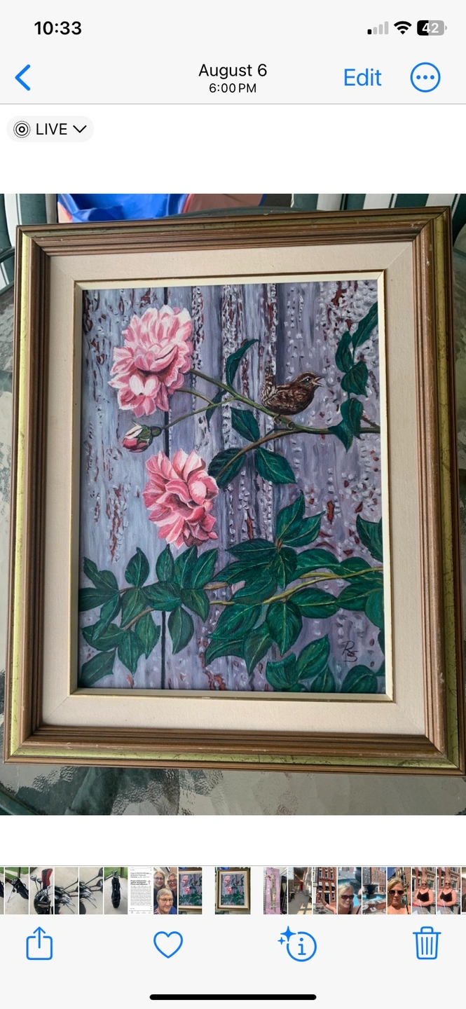 A framed painting of pink roses and a bird, likely a wren, on a grey wooden background.