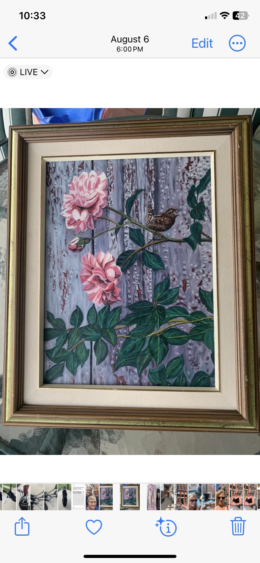 A framed painting of pink roses and a bird, likely a wren, on a grey wooden background.