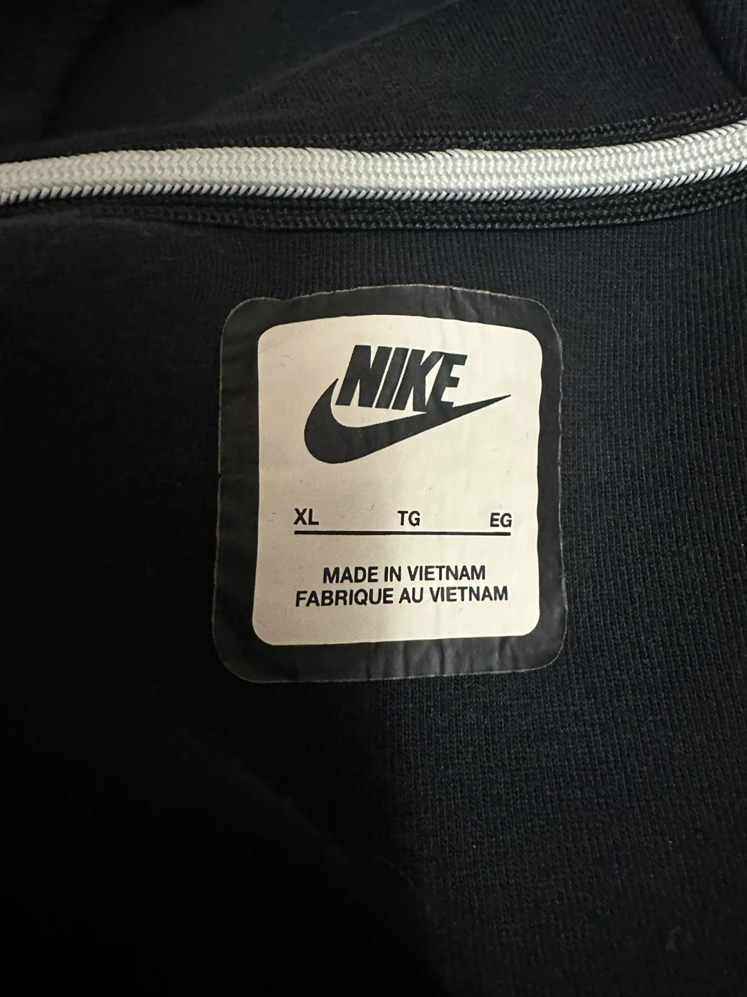 Black Nike Tech Fleece joggers and zip-up hoodie set. Joggers are size L (146-156 CM), and the hoodie is size XL (TG). Made in Vietnam.