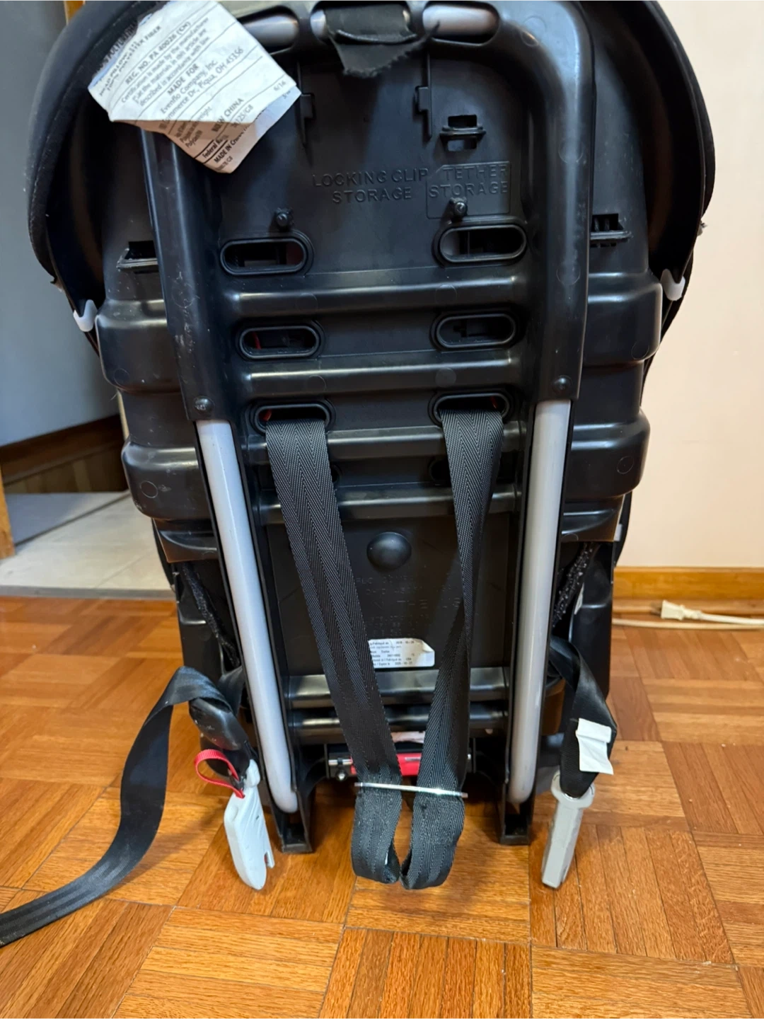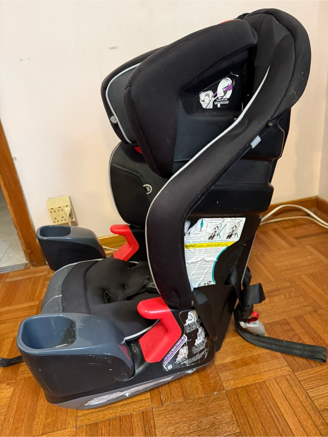 This is an Evenflo booster car seat. It's black with red accents and includes two cup holders. The adjustable headrest ensures a comfortable fit as your child grows. It's suitable for children who have outgrown their forward-facing harness. This seat is perfect for keeping kids safe during car rides.