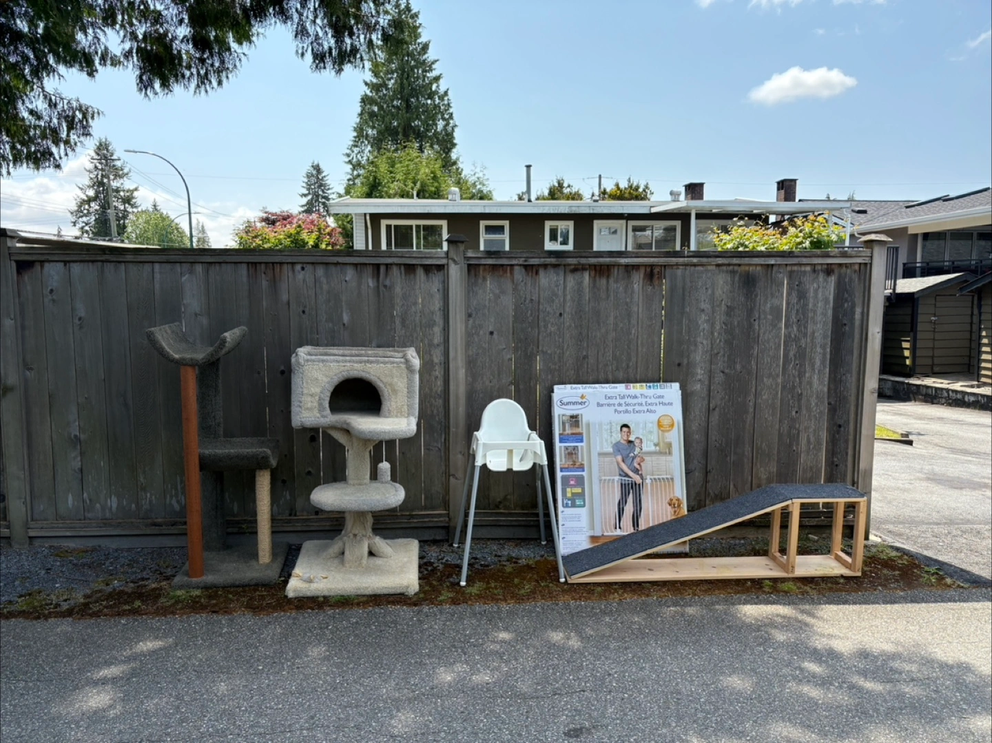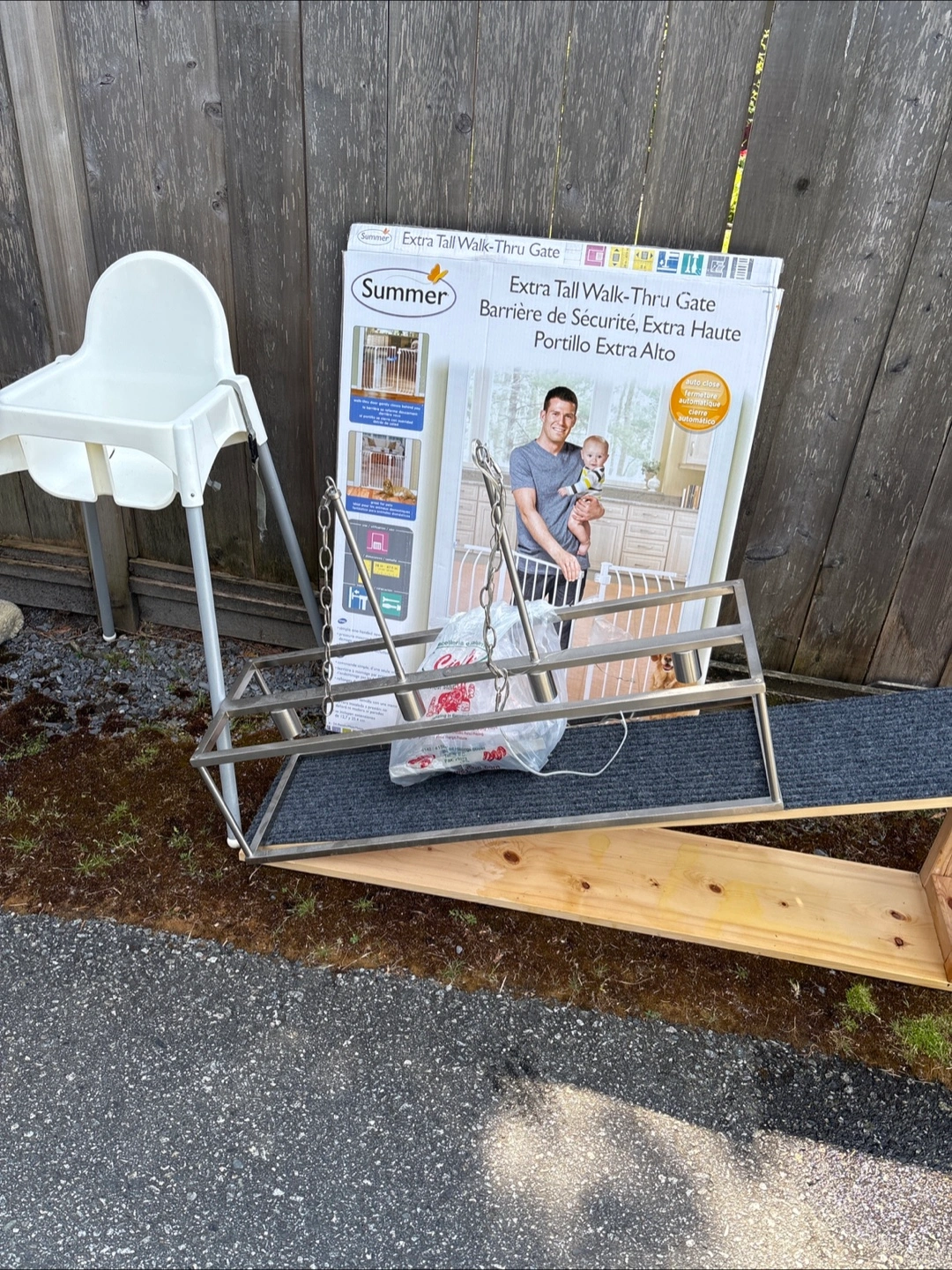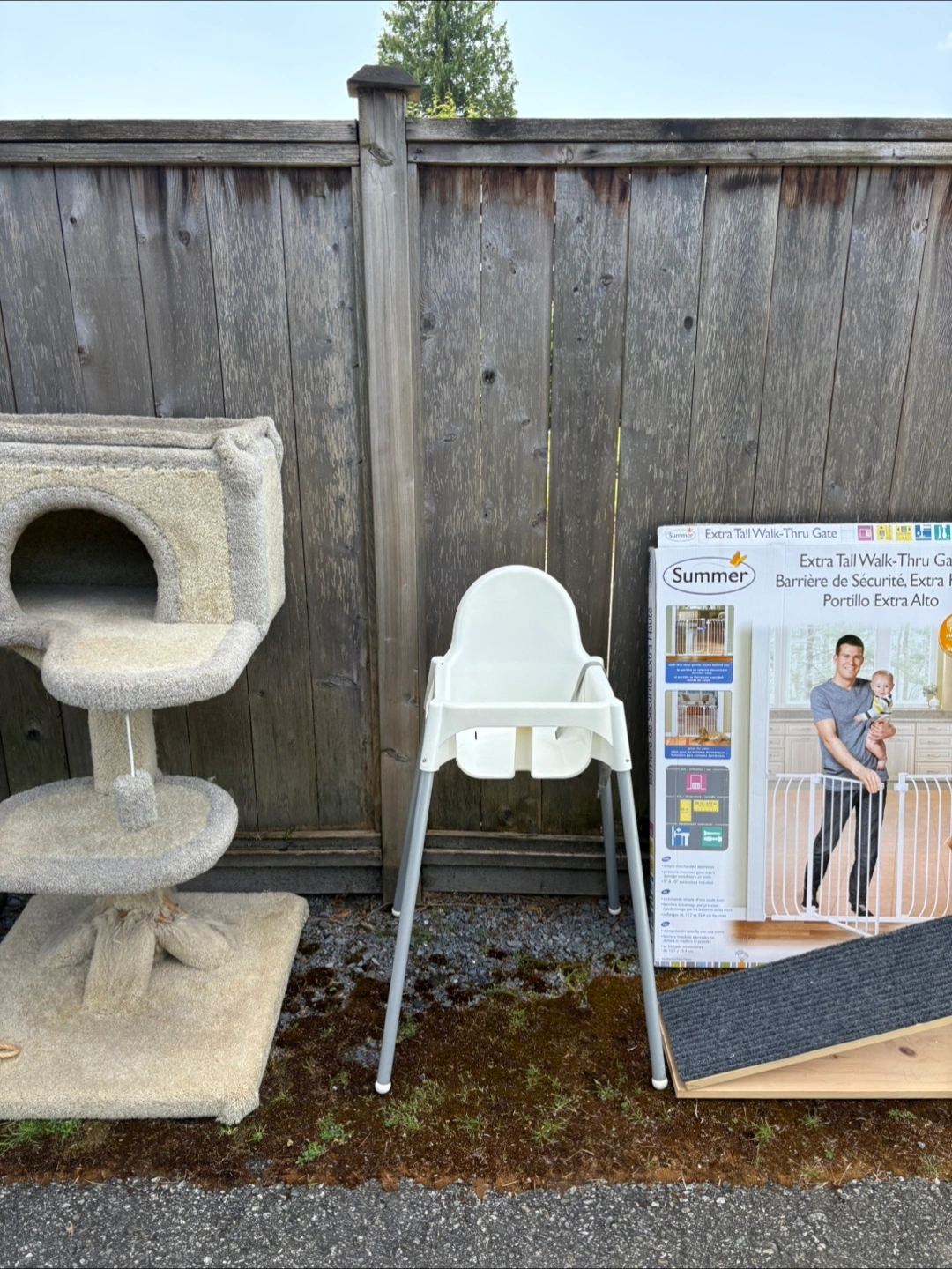 An assortment of pet and baby items. The cat tree offers a space to lounge and climb. There is also a high chair for infants. A wooden ramp offers an area to assist a pet to climb. The baby gate provides a walk-thru option for adults. Items can bring ease and comfort to your daily life. Items located in alley behind 1221 Brisbane avenue. Chandelier recently added to free items. Please don’t message and just come by