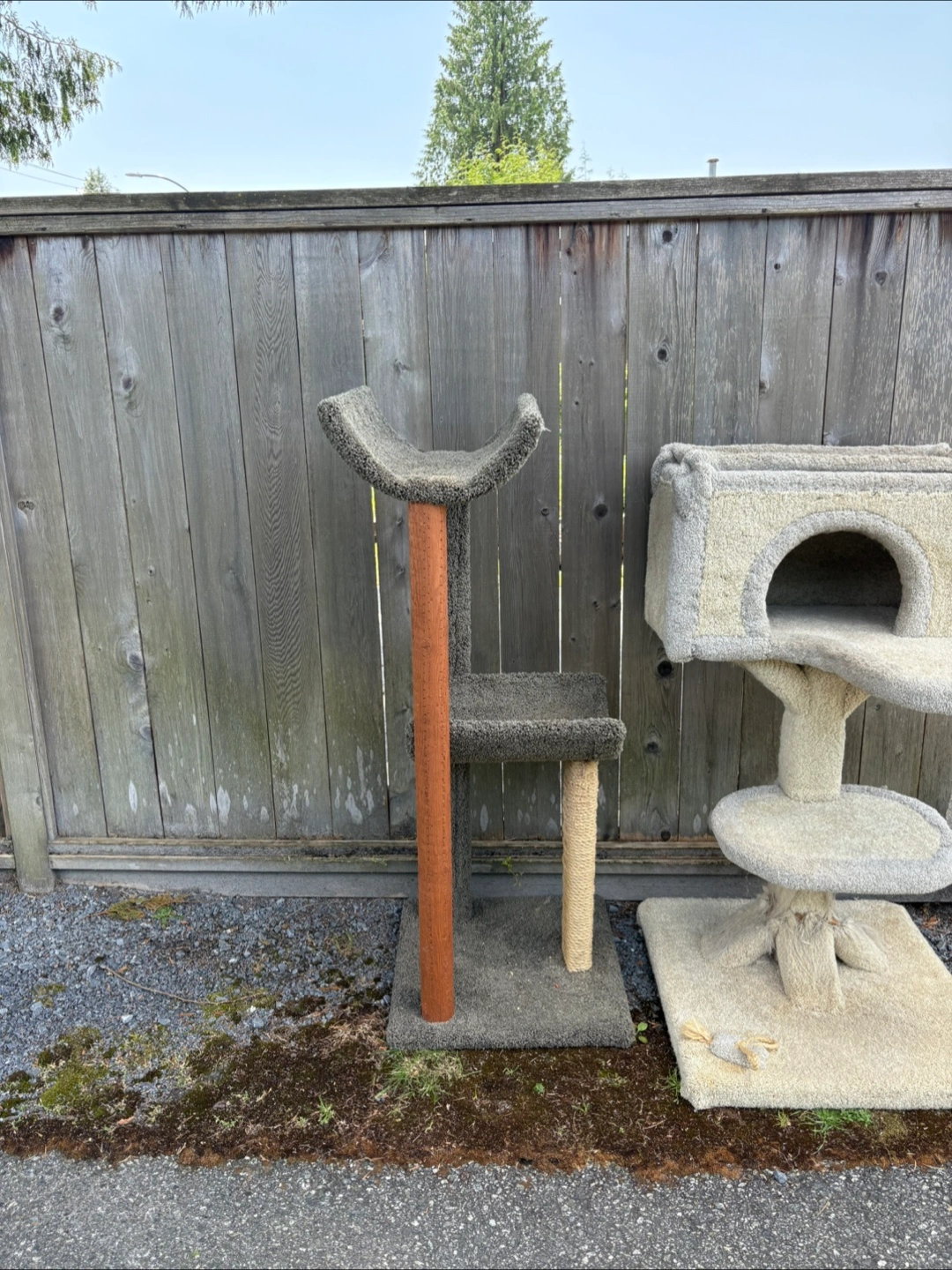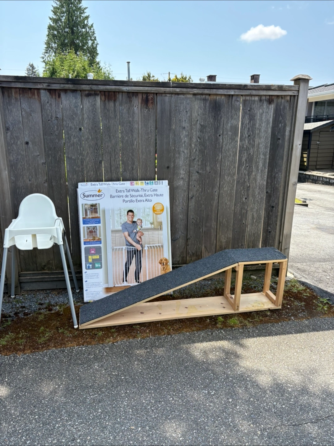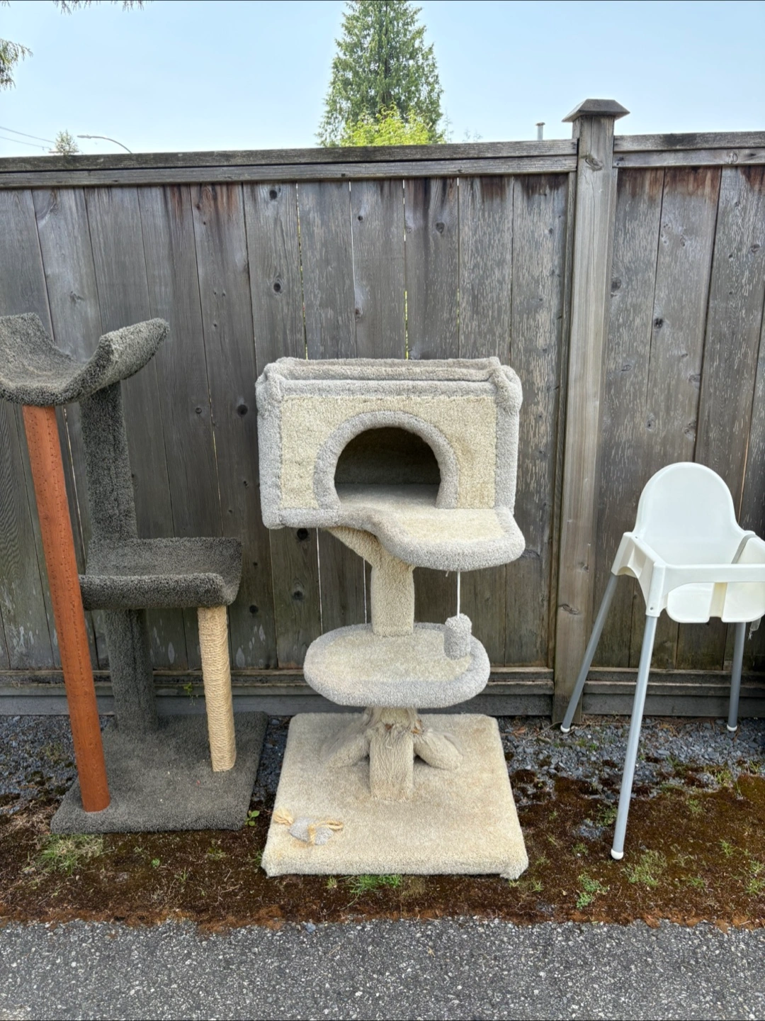 An assortment of pet and baby items. The cat tree offers a space to lounge and climb. There is also a high chair for infants. A wooden ramp offers an area to assist a pet to climb. The baby gate provides a walk-thru option for adults. Items can bring ease and comfort to your daily life. Items located in alley behind 1221 Brisbane avenue. Chandelier recently added to free items. Please don’t message and just come by