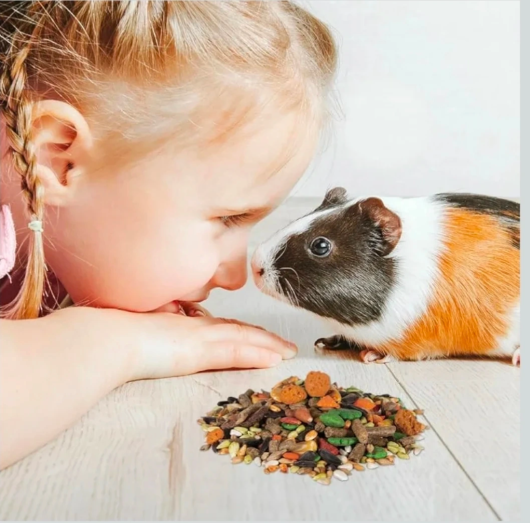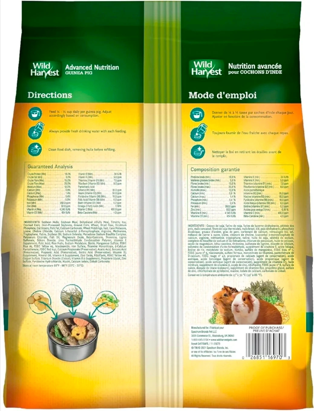 This is Wild Harvest Advanced Nutrition Guinea Pig food. It's a 3.6 kg bag. It contains a great-tasting mix of alfalfa, vegetables, and Timothy Hay. It's formulated with vitamins, minerals, and omega-3 fatty acids for healthy skin and fur.