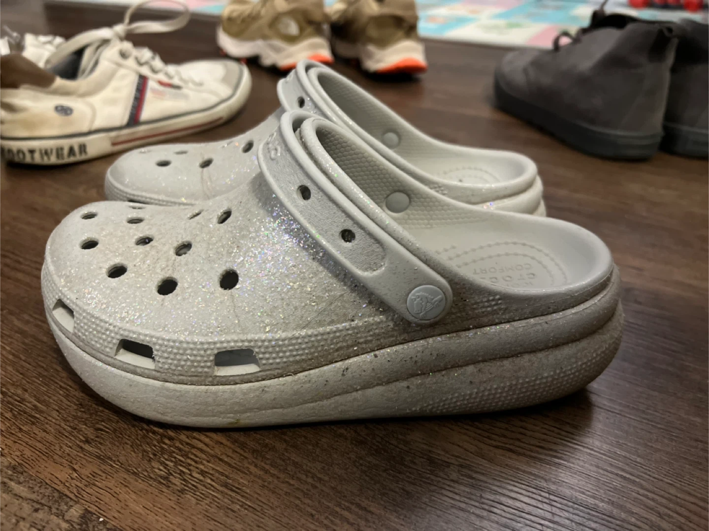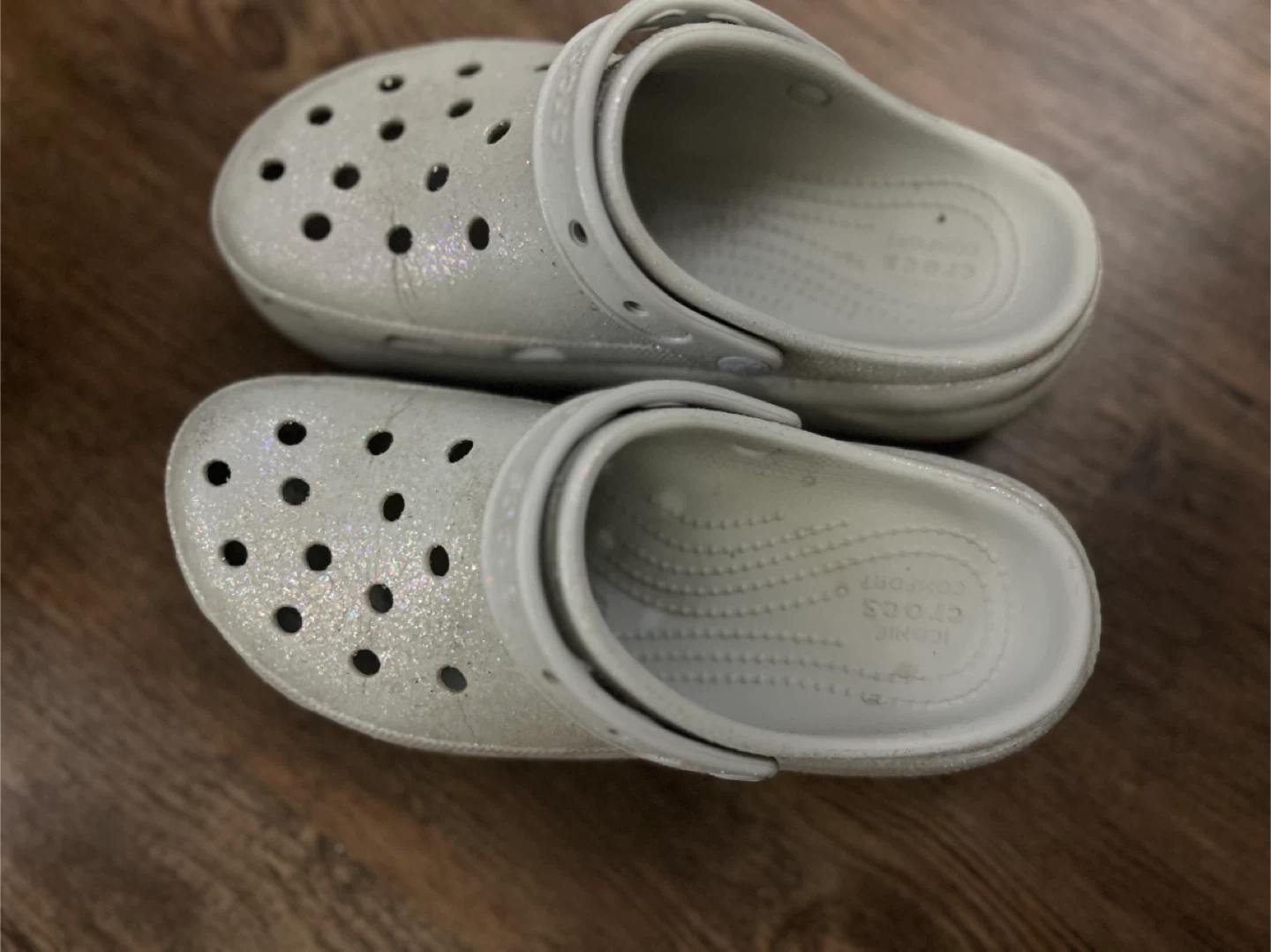 Selling a pair of Crocs Classic Platform Clogs in a sparkly, light grey colour! They're in good condition with some signs of wear. These are a Women's size 7. Perfect for adding a little height and sparkle to your everyday look!