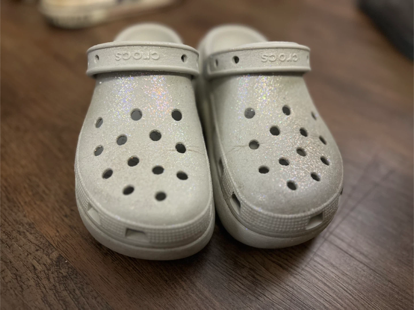Selling a pair of Crocs Classic Platform Clogs in a sparkly, light grey colour! They're in good condition with some signs of wear. These are a Women's size 7. Perfect for adding a little height and sparkle to your everyday look!