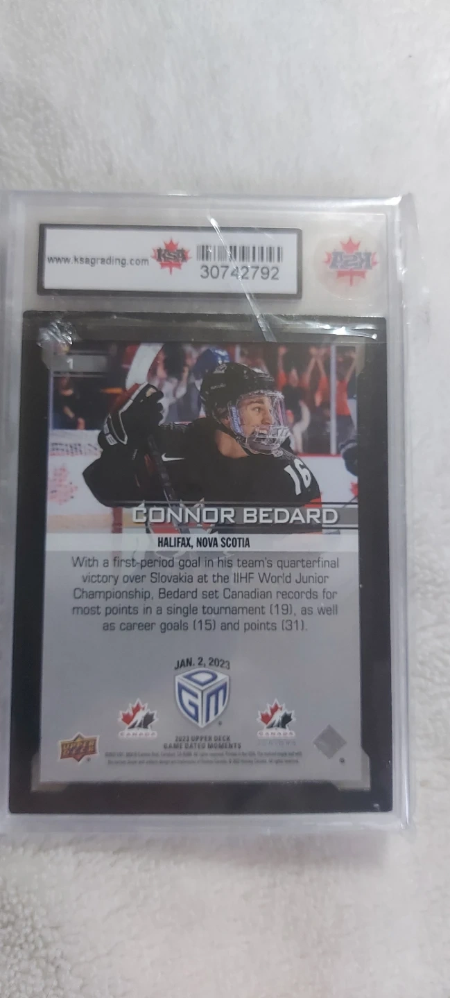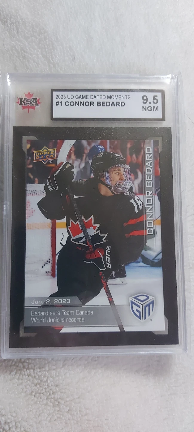 Selling a Connor Bedard 2023 Upper Deck Game Dated Moments #1 hockey card. It's graded 9.5 NGM by KSA.