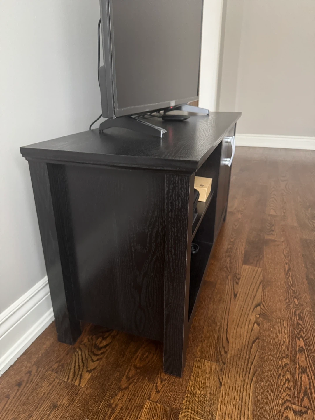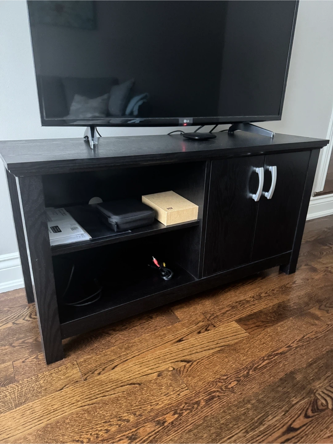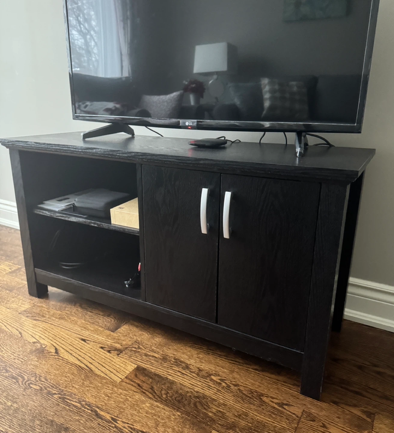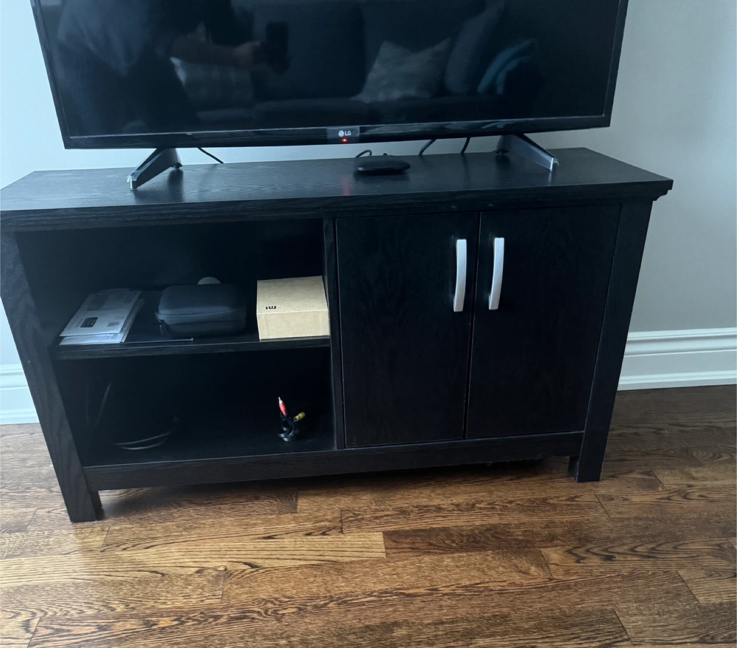 Selling a TV stand/console table in black. It's in good condition and has storage space with a shelf and cabinet. Perfect for organizing your entertainment area!