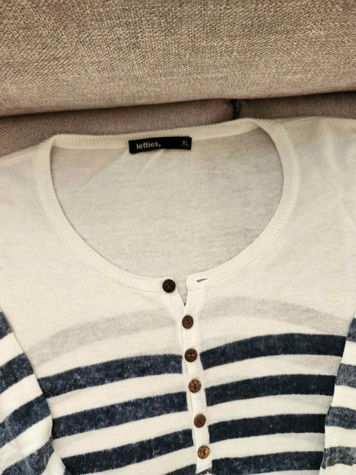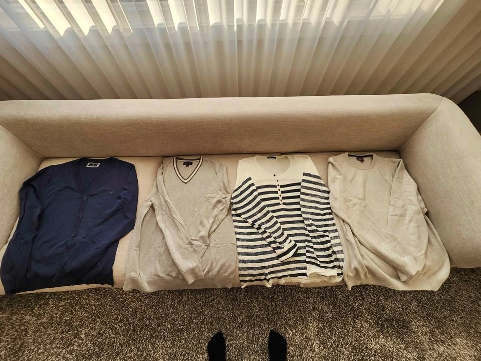 Set of 4 high-quality sweaters in good condition. Perfect for layering or business-casual wear. Navy V-Neck Cardigan: Brand: Forecast (Size XL). Grey V-Neck with Trim: Brand: Banana Republic Luxe Yarn (Size XL). Striped Henley Sweater: Brand: Lefties (Size XL). Grey Crewneck Sweater: Brand: Denver Hayes (Size 2XL). From pet free and smoke free home. Pick up in Chestermere.