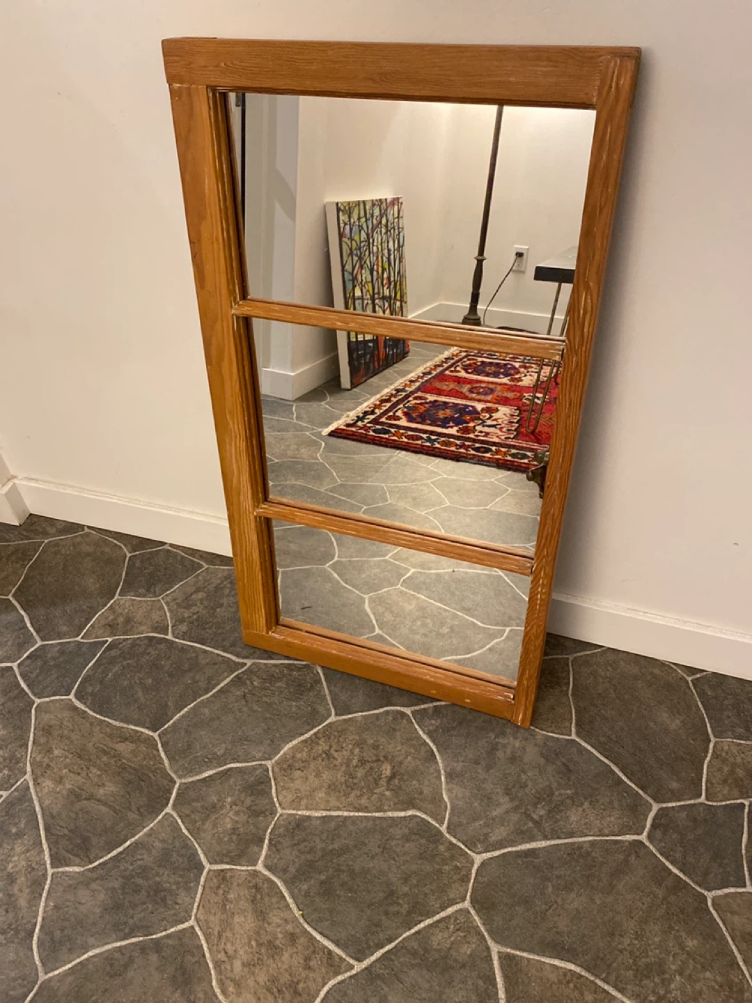This mirror has a warm, light brown wooden frame. It features a unique design with horizontal dividers creating three mirrored sections. It's a lovely accent piece for any room in the house!