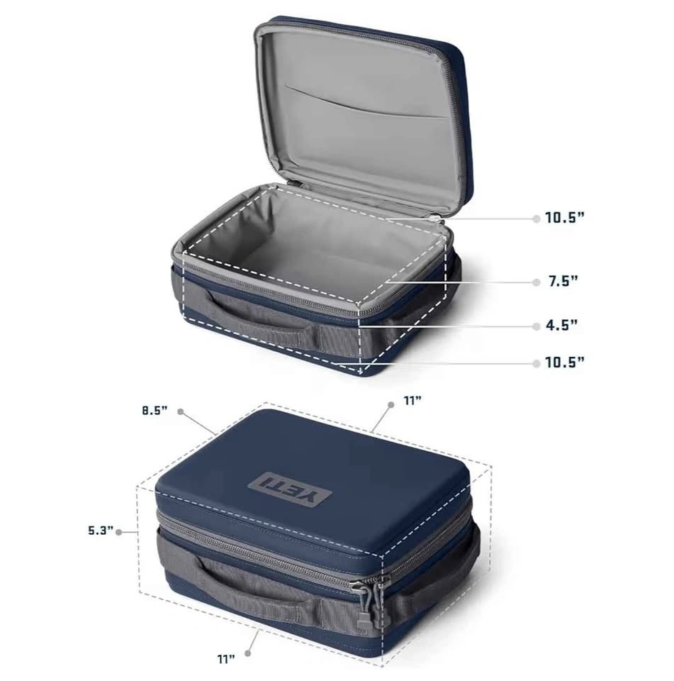 Durable YETI 5 litres Daytrip Lunch Box in olive green. Great for keeping snacks and drinks cool. Exterior measures 11" L x 8.5" W x 5.3" H. Interior measures 10.5" L x 7.5" W x 4.5" H. Features a top handle and zipper closure.