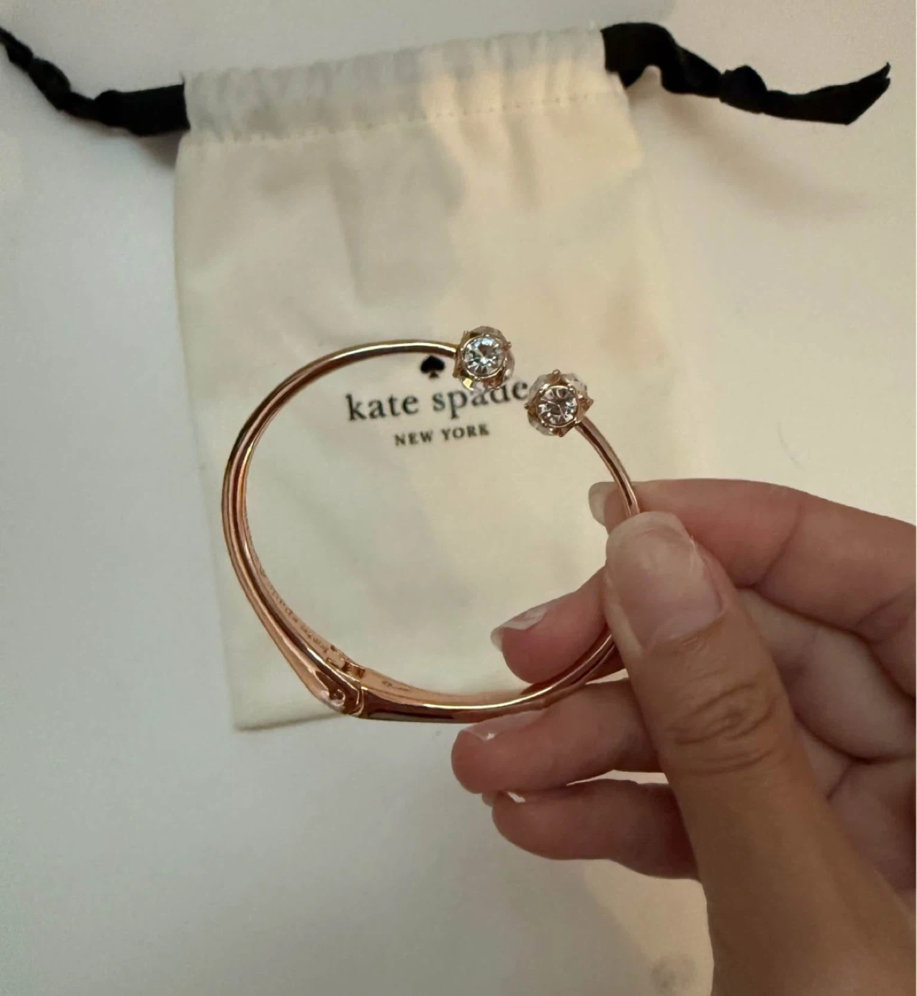 Selling a Kate Spade bangle in rose gold with crystal details! It's a lovely piece to add a touch of sparkle to any outfit. Comes with the original Kate Spade pouch for safekeeping. Perfect accessory or a gift for someone
