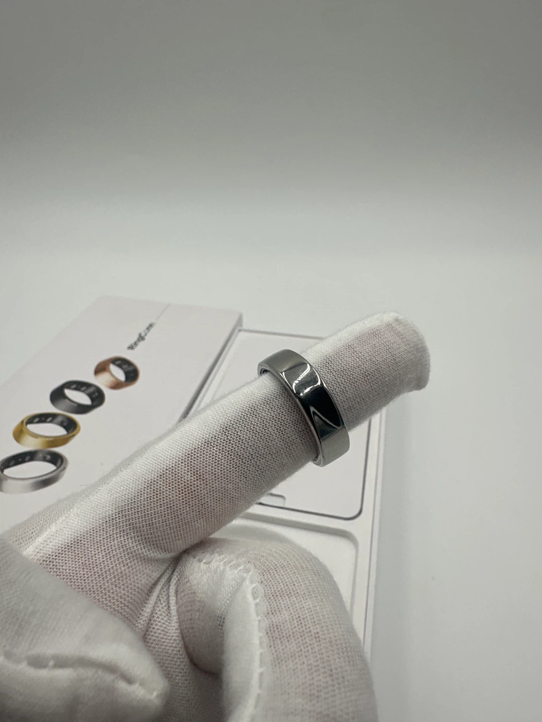 This is a RingConn smart ring. It's silver and comes in its original packaging with the charger. The packaging shows different colour options for the ring.