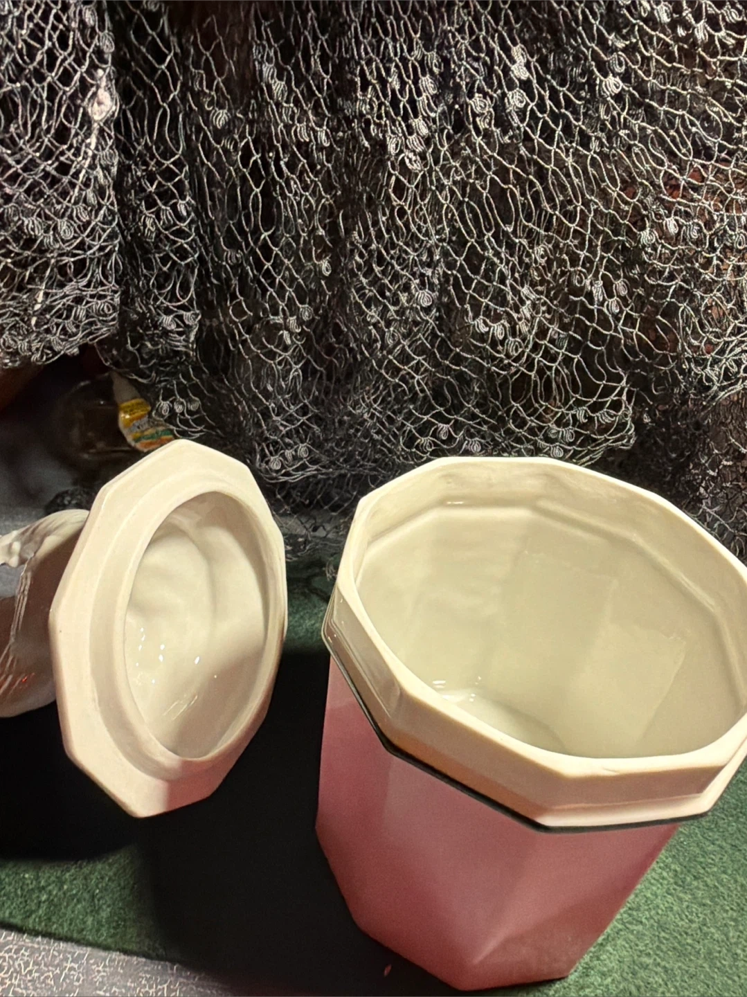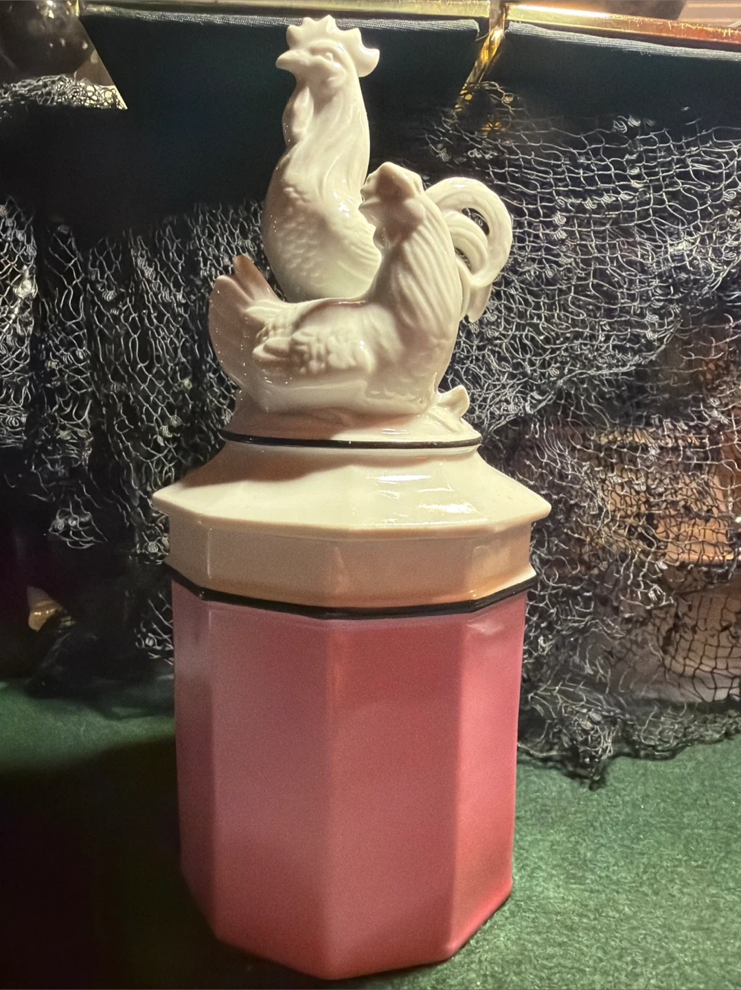 This is a vintage ceramic jar featuring a decorative rooster lid. It's a charming piece for kitchen or home decor. The jar is pink with a white lid and topper.