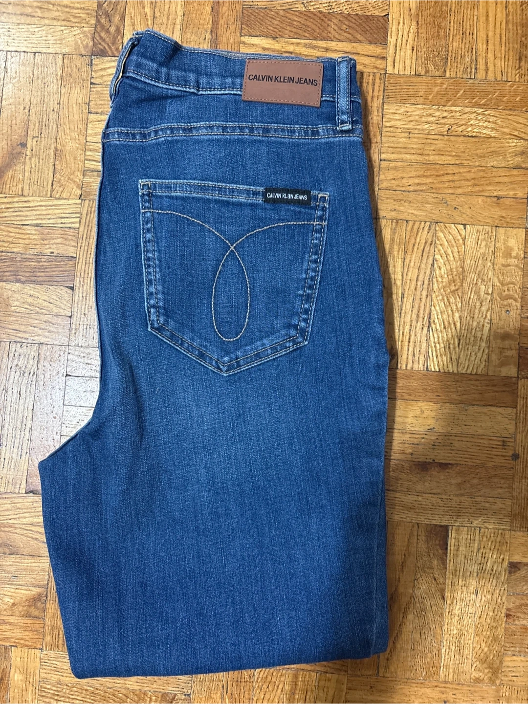 Classic blue denim jeans from Calvin Klein. These pants offer a timeless look and feel. Made with durable denim material.