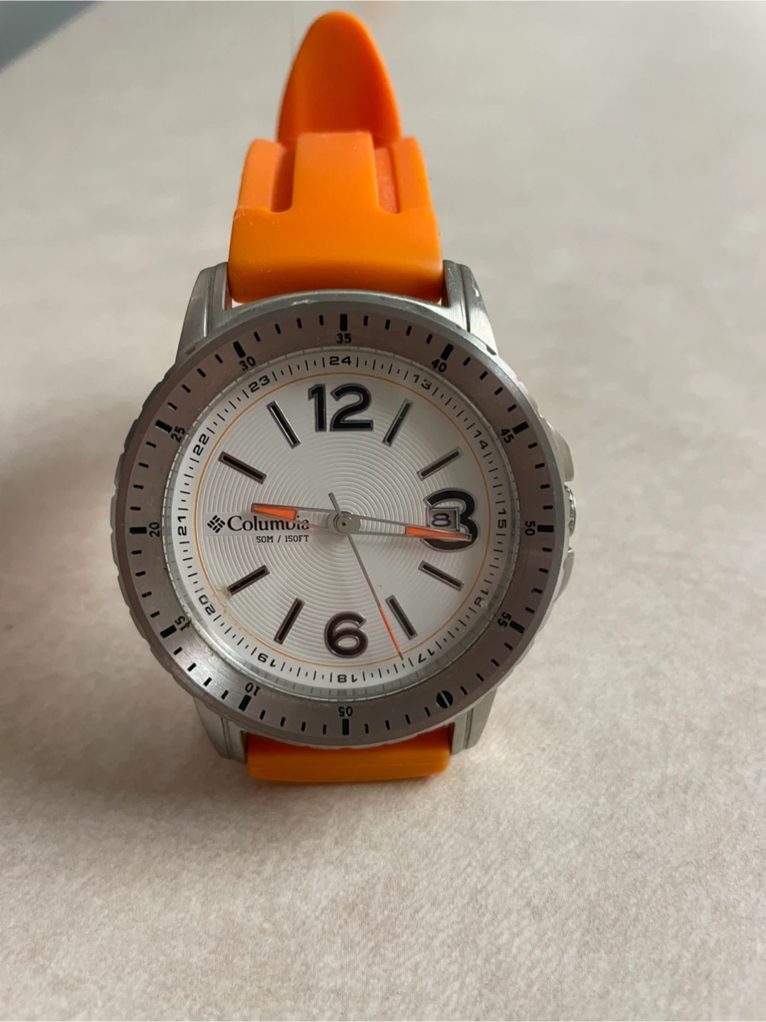This Columbia watch features a white dial with clear Arabic numerals and a sporty orange silicone strap. It's water-resistant up to 50 meters (150 feet). This timepiece is great for everyday wear or outdoor adventures!