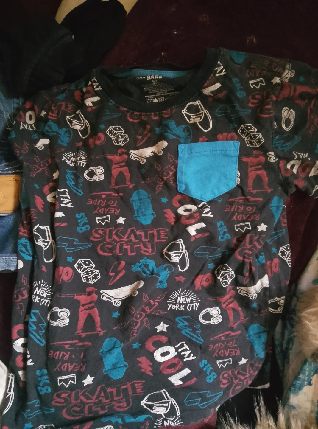 This is a cool black t-shirt with a fun skate graphic print. It has a blue chest pocket. Made for comfort and style!