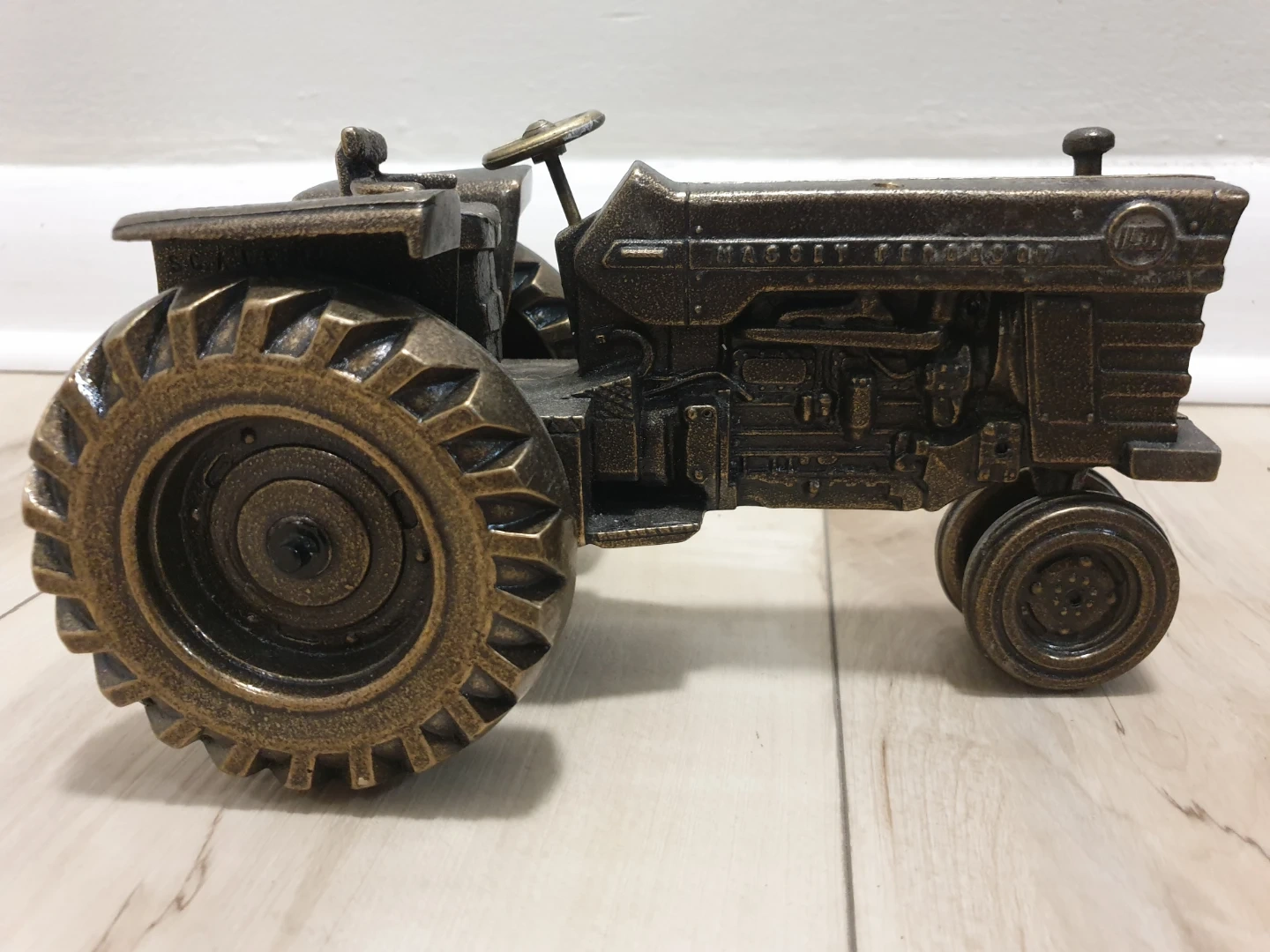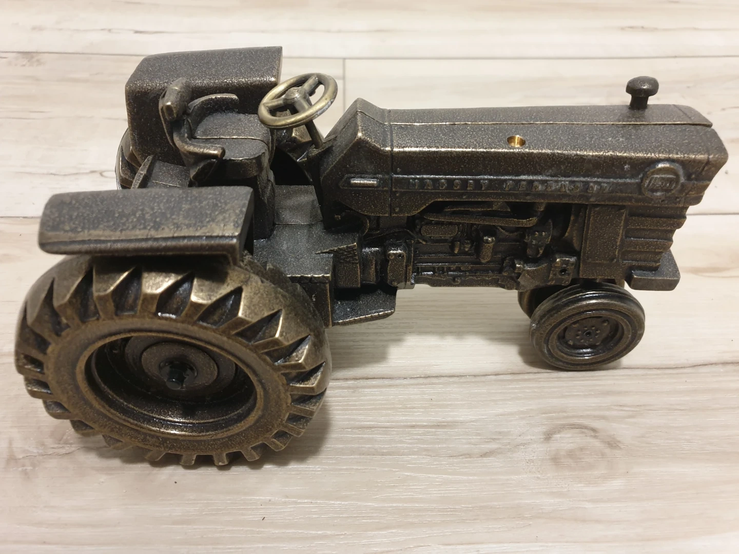 This is a detailed brass figurine of a Massey Ferguson tractor. It features intricate details replicating the engine and tires that actually spin.