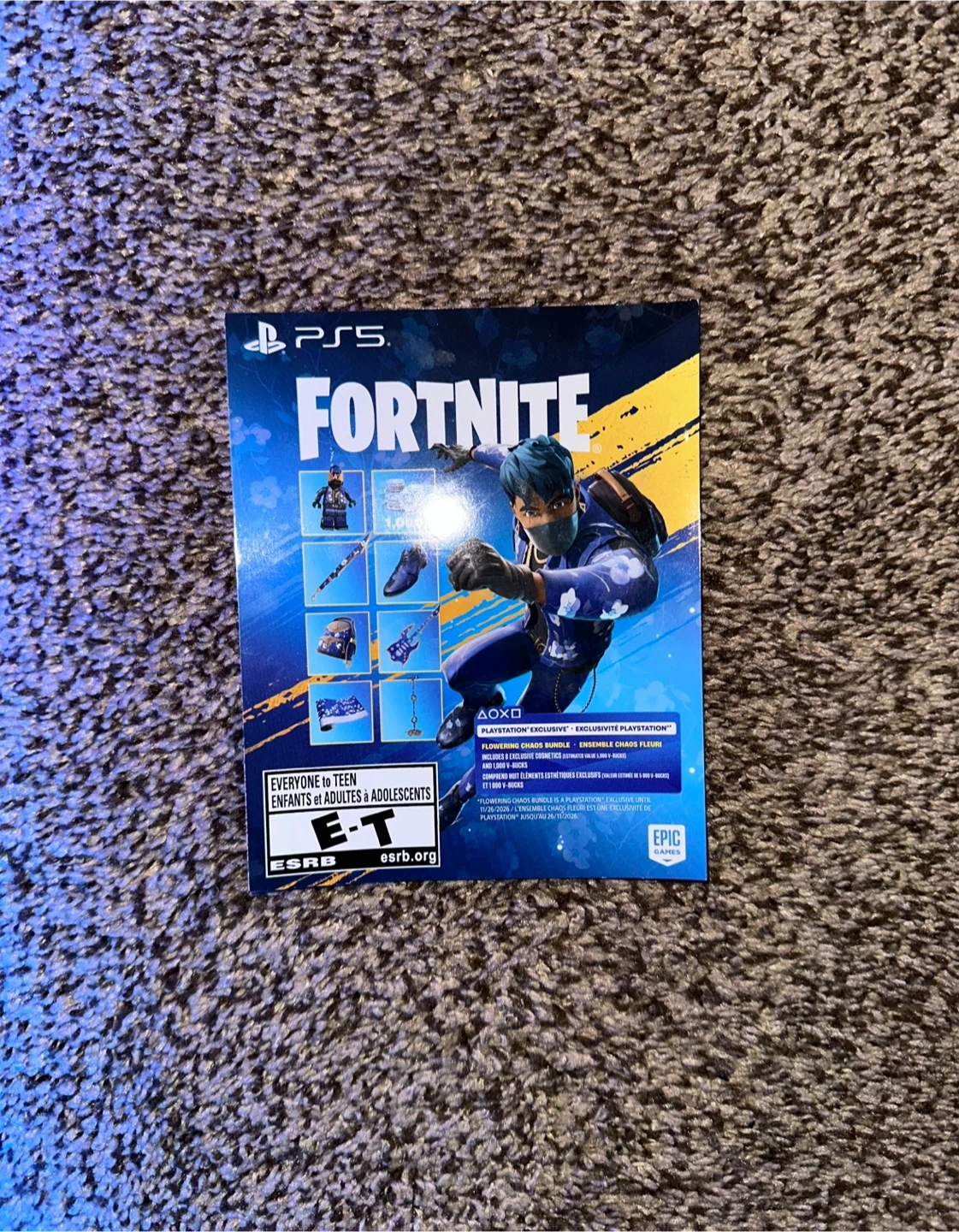Up for sale is my Exclusive Fortnite Flowering Chaos Bundle Digital Code for PS5. This bundle comes with 8 exclusive cosmetic items along with 1,000 V-Bucks. The code of the back has not been scratched.