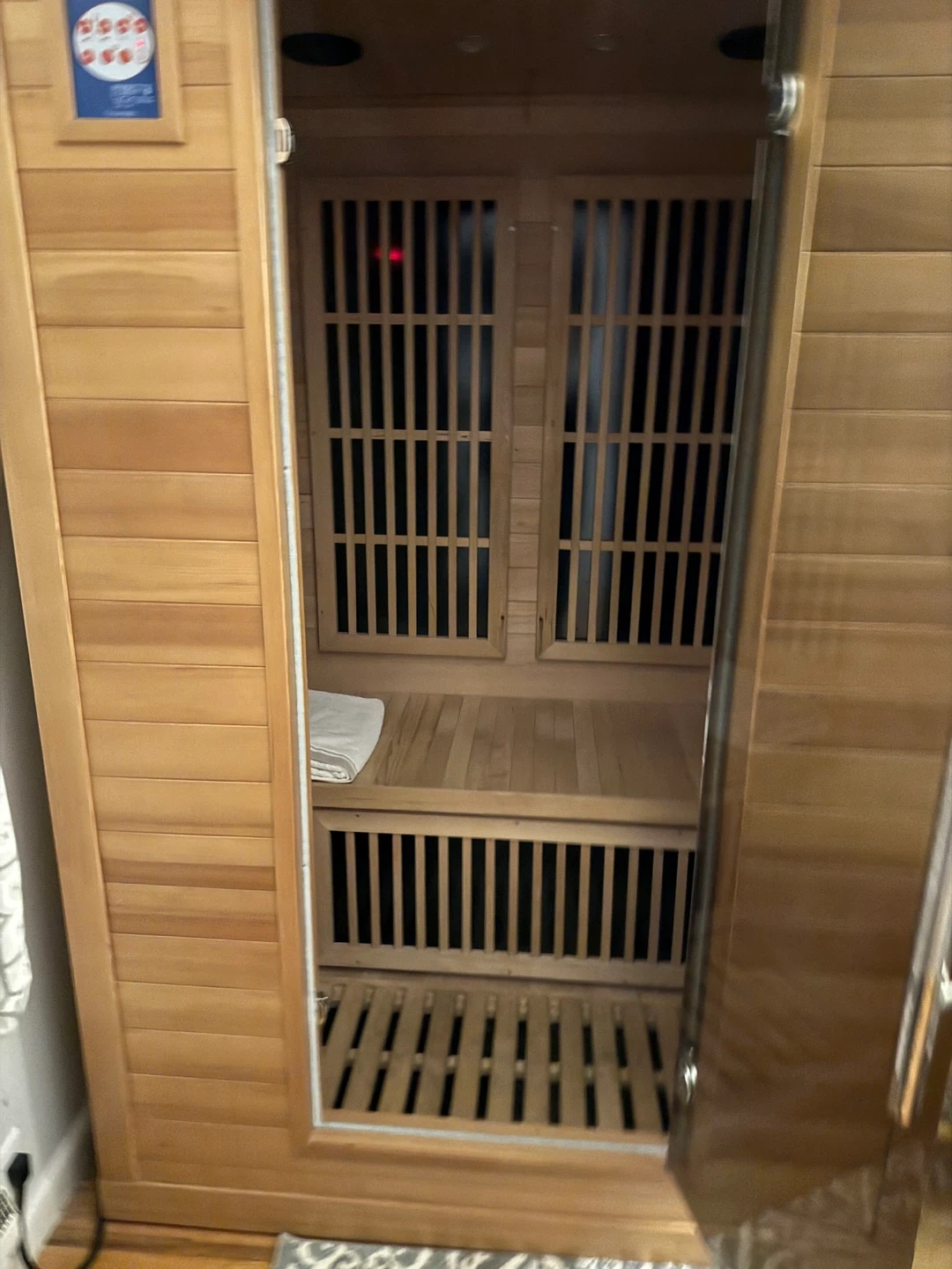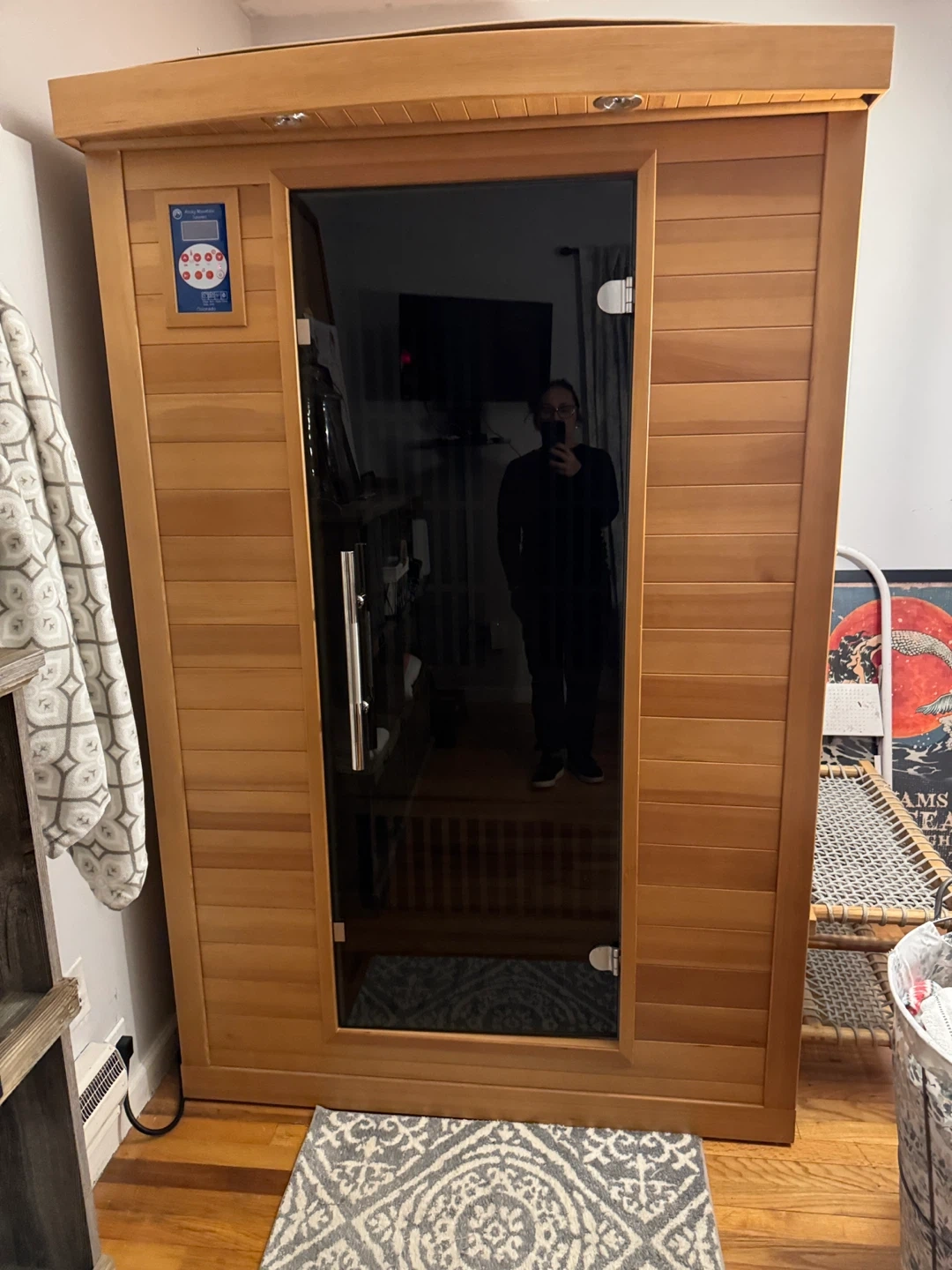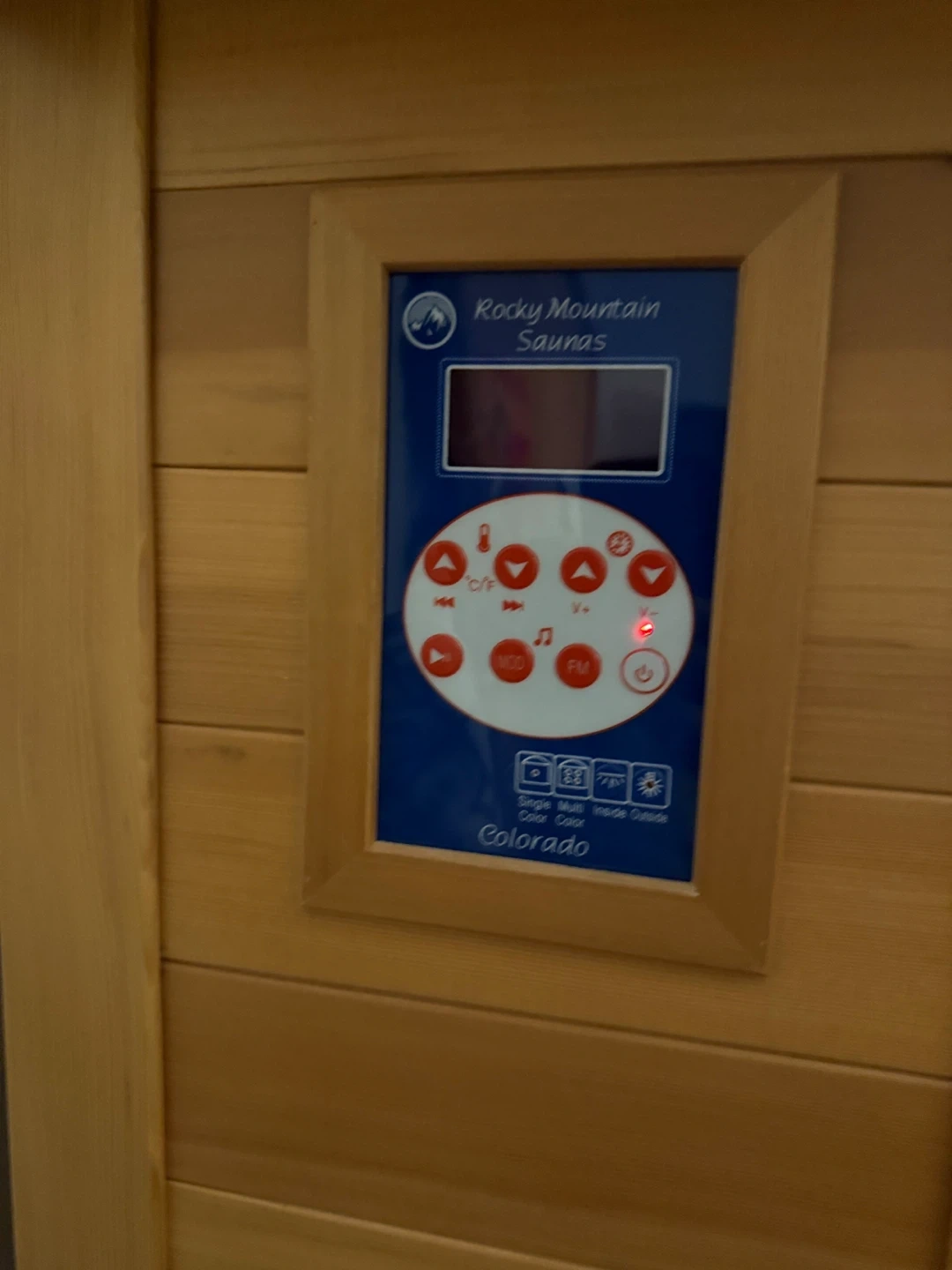 This is a Colorado Infrared Sauna from Rocky Mountain Saunas. It's made of wood and includes a control panel with various settings. This sauna is designed for personal use. Seat two people comfortably.
