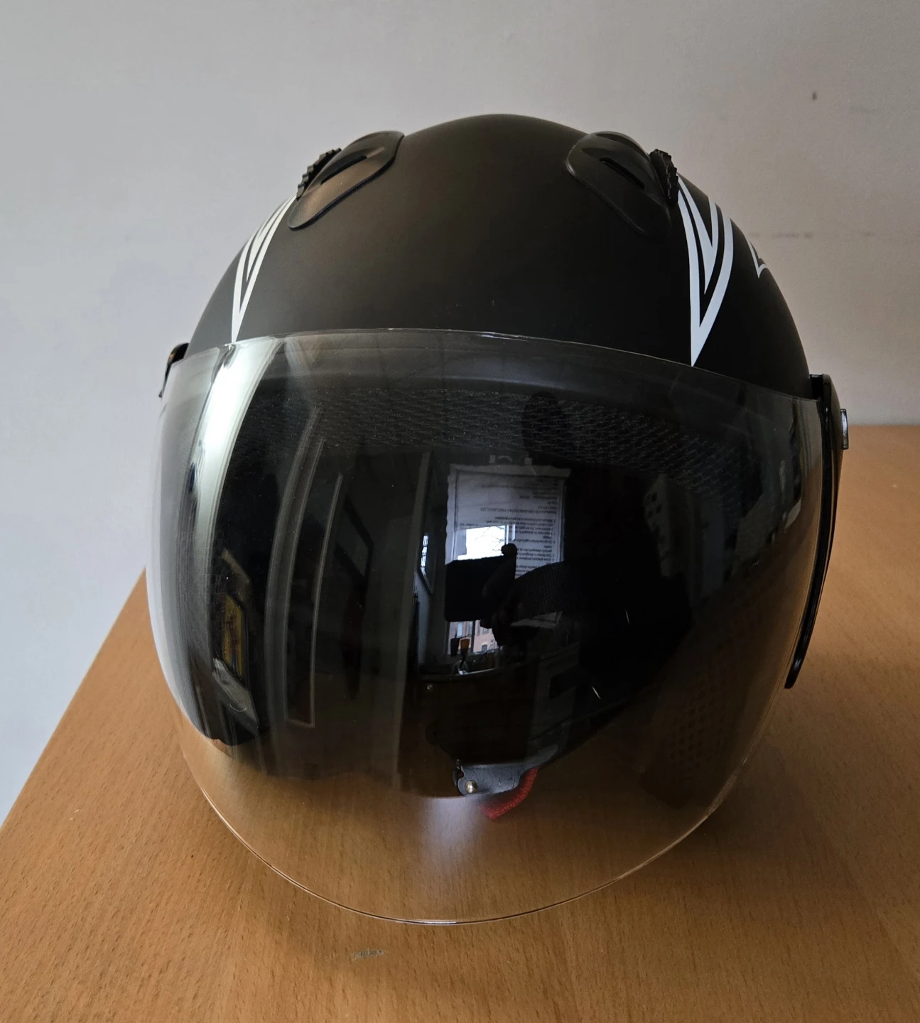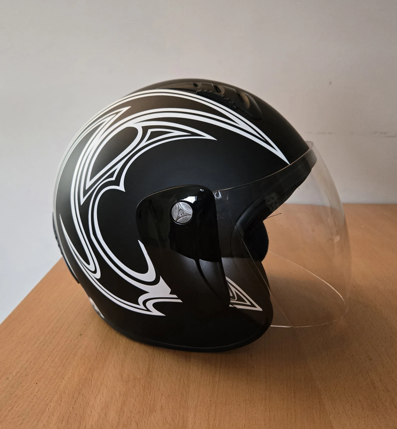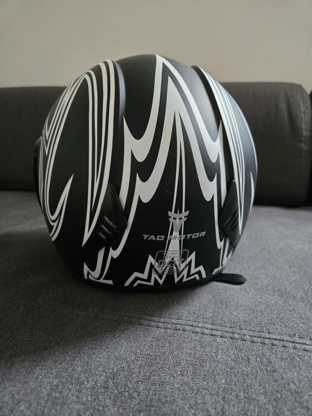 Selling a Tao Motor 818 helmet in black with white accents. It has a clear visor and is in great condition. Perfect for scooter or motorcycle riding! D.O.T Certified Approved