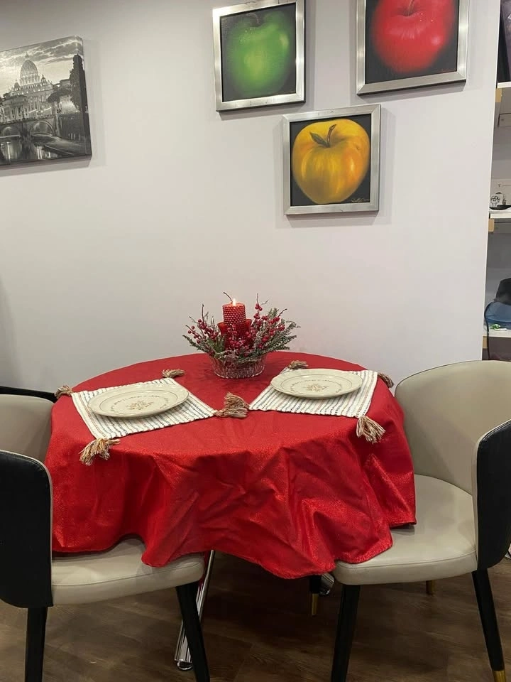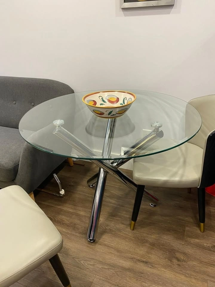 Beautiful and modern dining table with a metal base and glass top. It has been lightly used, and the glass is scratch-free. It's very practical for small spaces. Its dimensions are 72 cm high and 100 cm in diameter.