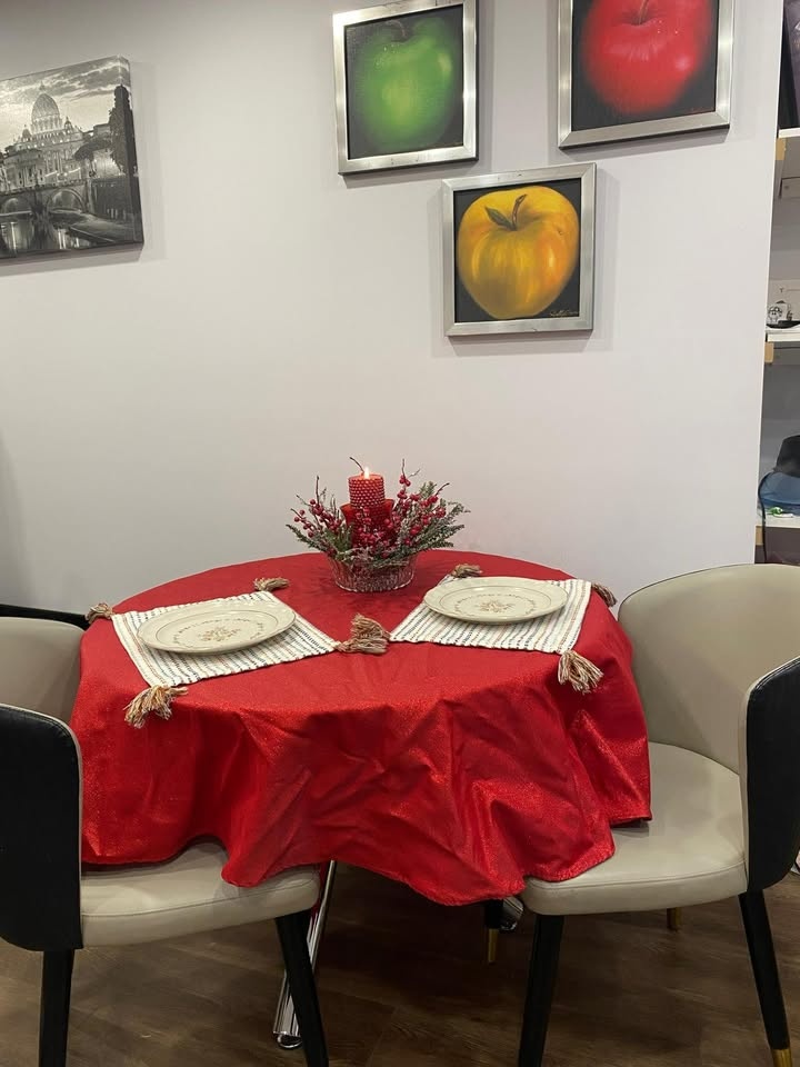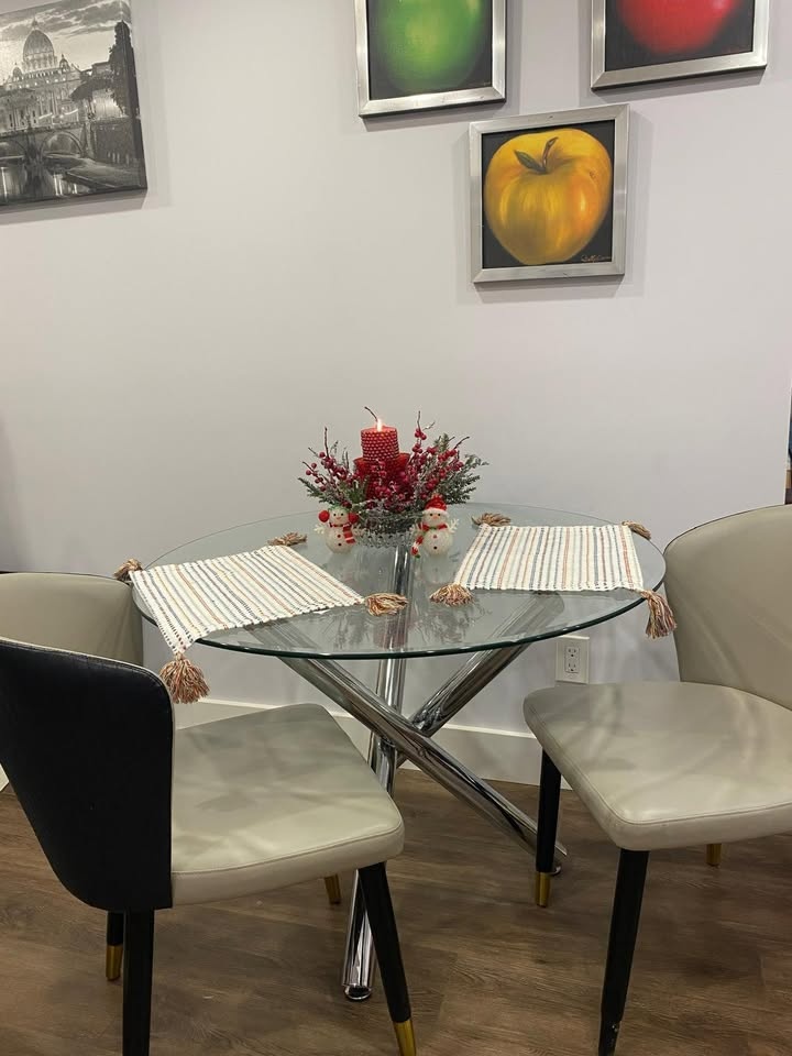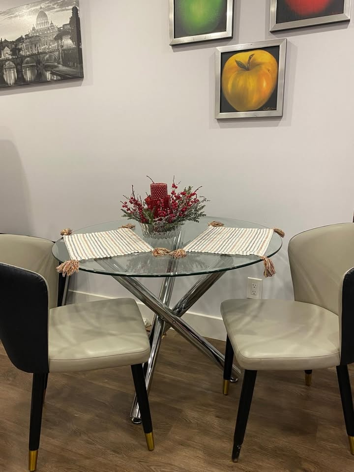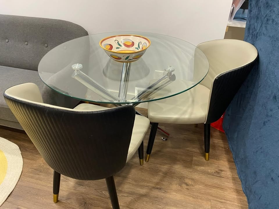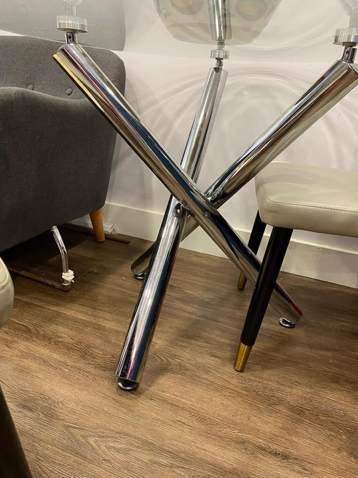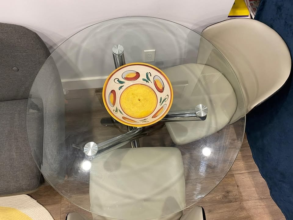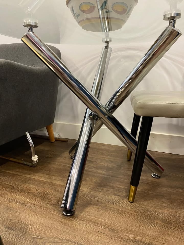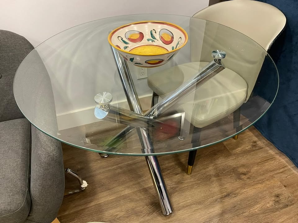 Beautiful and modern dining table with a metal base and glass top. It has been lightly used, and the glass is scratch-free. It's very practical for small spaces. Its dimensions are 72 cm high and 100 cm in diameter.