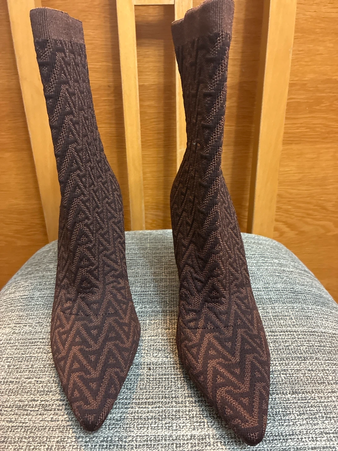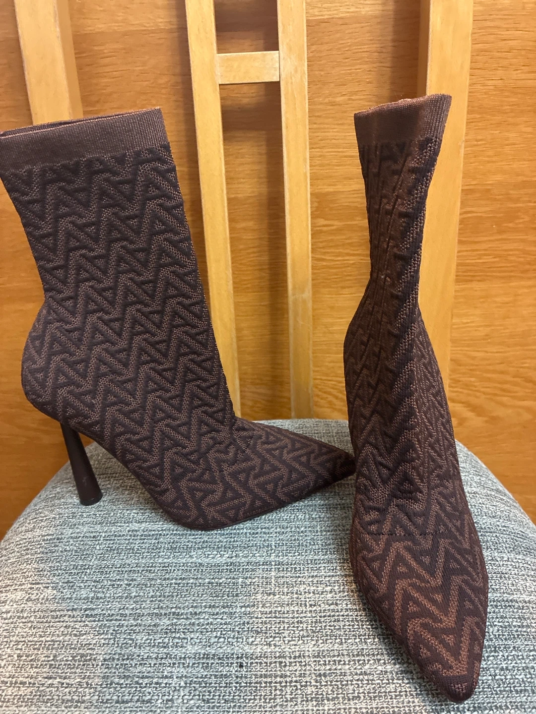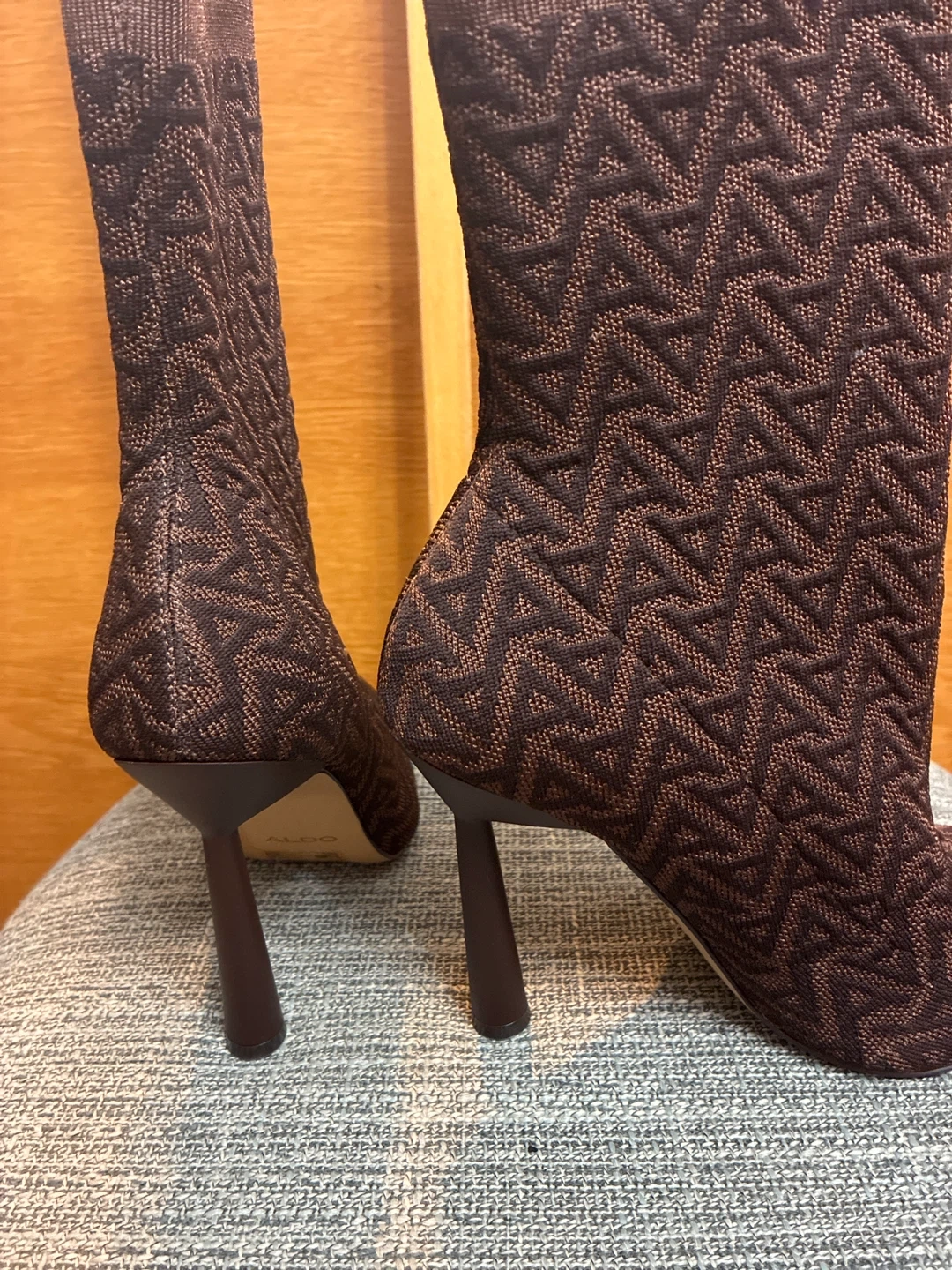 Selling a pair of brand new ALDO heeled boots in a stylish brown knit pattern. Size 7