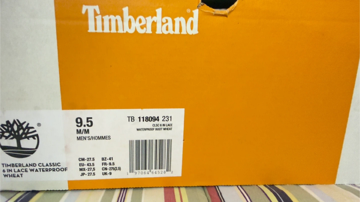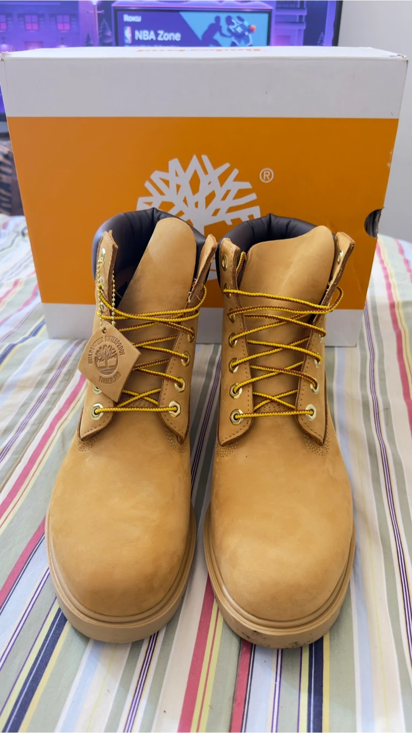 Timberland Classic 6-Inch waterproof boots in tan nubuck. Features a padded collar and lace-up closure with yellow laces. Includes original box. Size 9.5 M/M.