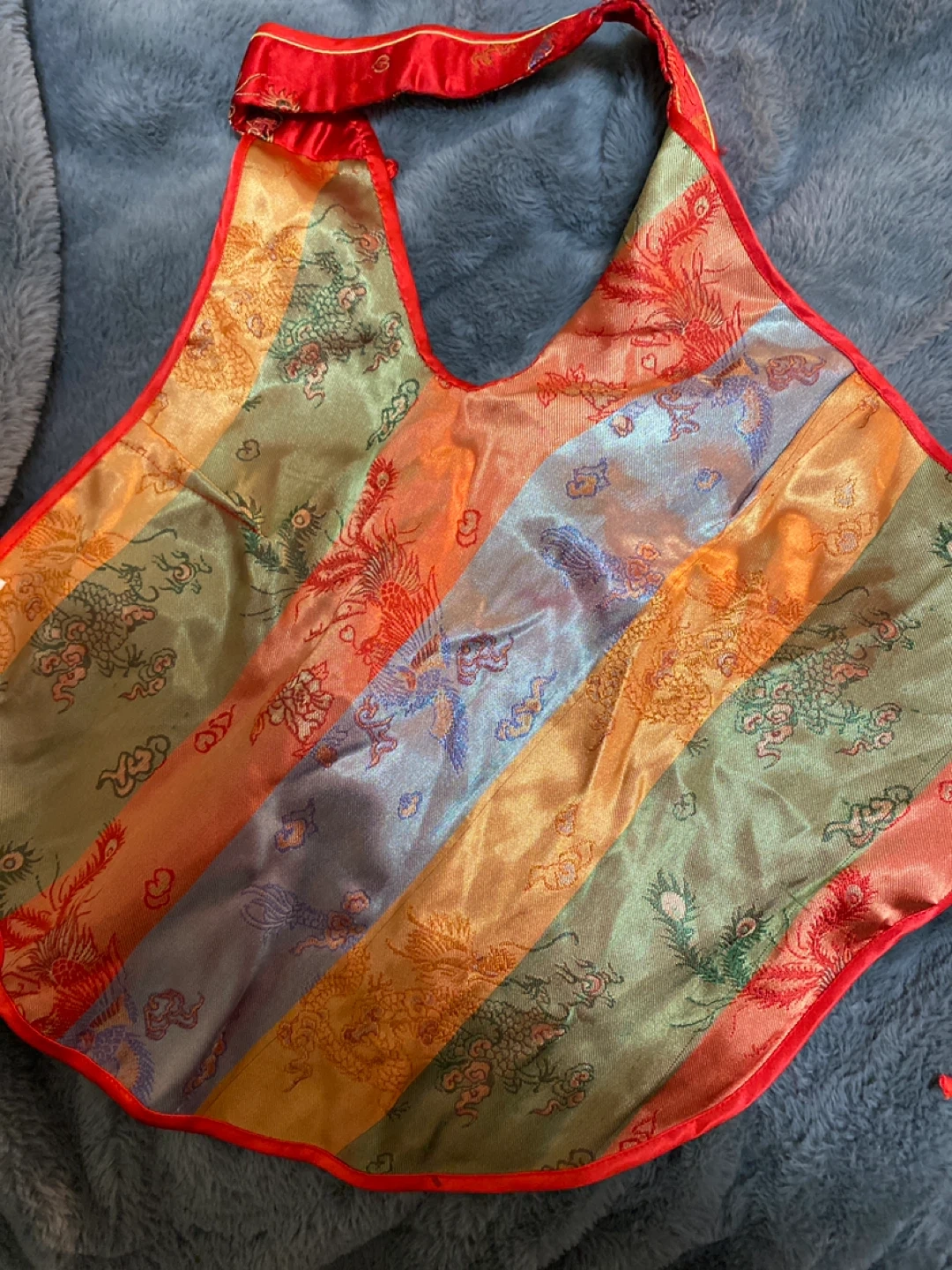 This vibrant red top features a beautiful dragon print. It's made from a silky material, with gold trim. The multi-coloured striped back adds a unique touch.