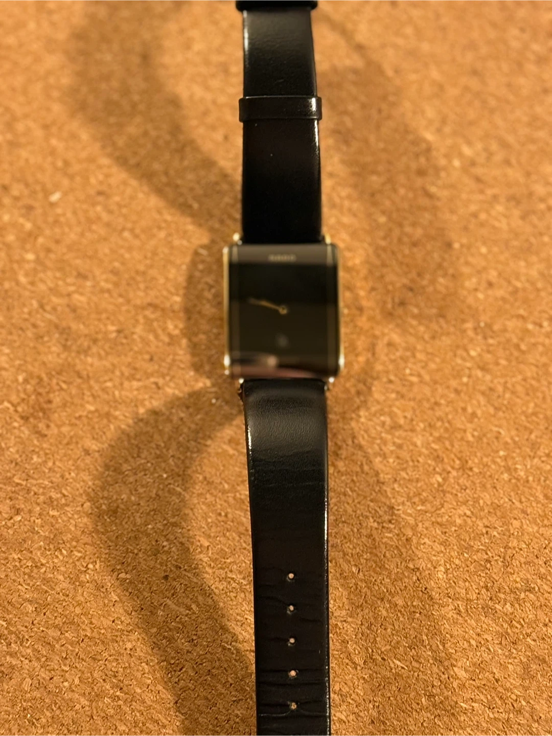 Selling a beautiful Rado Florence watch. It features a sleek black face with gold accents and a black leather strap. The back casing indicates it's watersealed and has a sapphire crystal. A timeless piece!