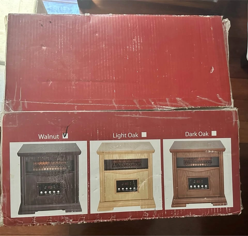 Programmable time and temperature. Good enough to maintain the temperature of a large room. Cool touch exterior cabinet with environmentally friendly reforested wood, safe for kids and pets. Two heat settings: Low (750 watts), High (1500 Watts). Missing remote. Good working condition but has wear and tear marks on the cabinet.
