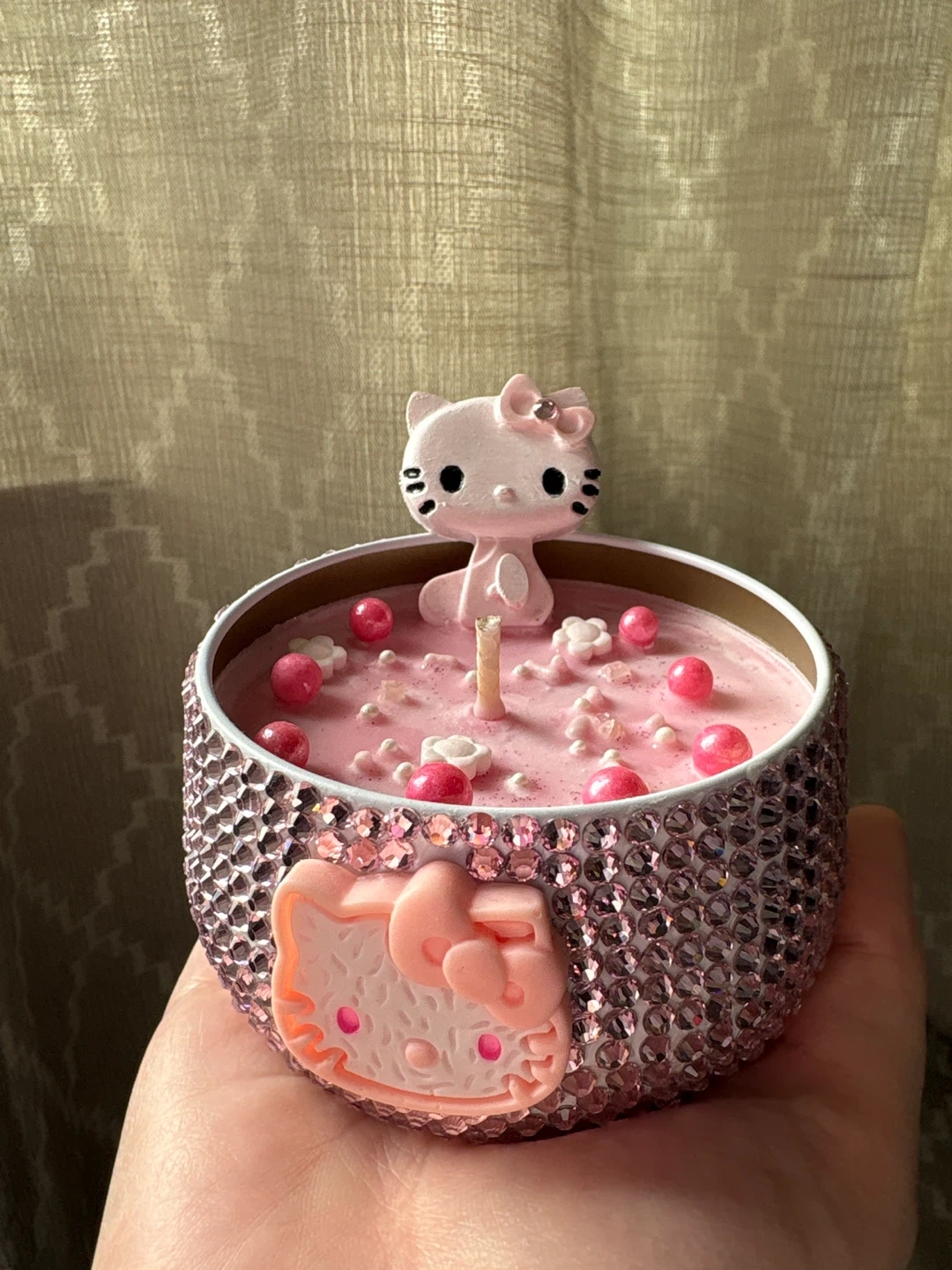 Sanrio Hello Kitty kawaii decorative candle with a sparkling rhinestone jar and sweet pastel design. Poured using 100% soy wax and a cotton wick for a clean, even burn.