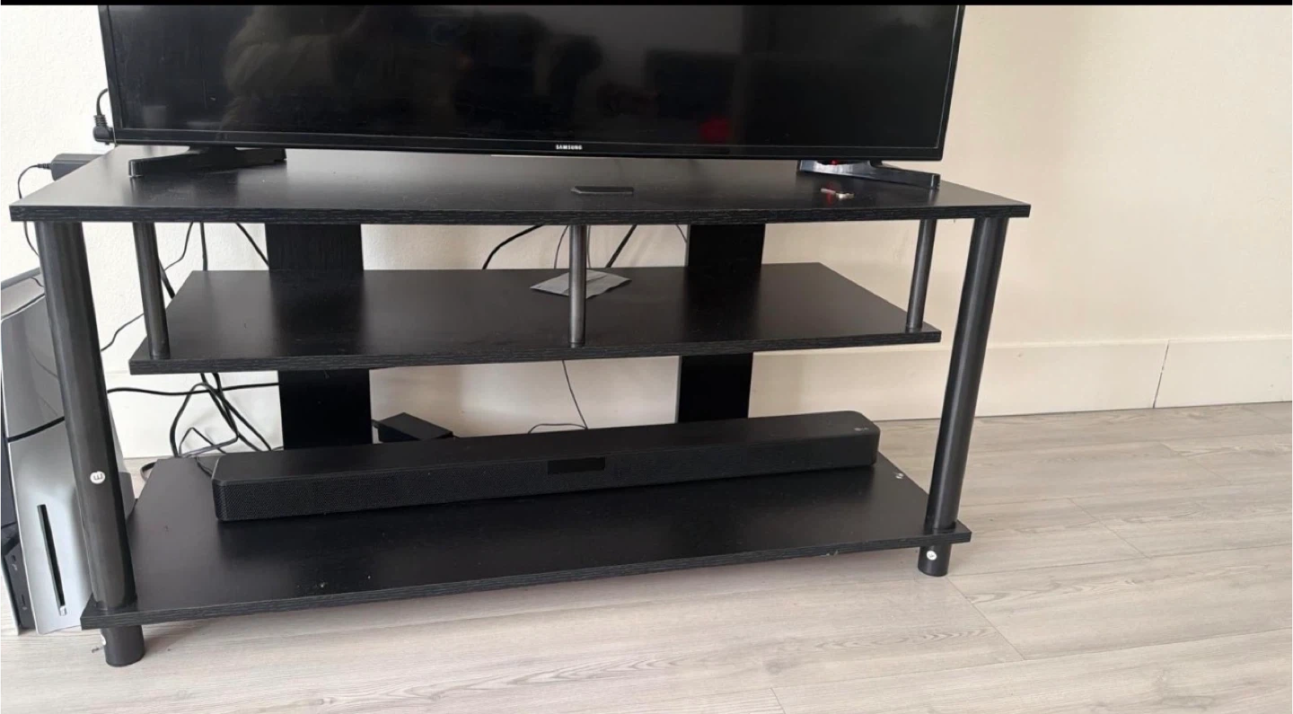 Buy & SellBlack 3-Shelf TV StandBlack 3-Shelf TV Stand$32This is a 3-shelf black TV stand. It's made of particleboard and metal. It has three open shelves for media consoles and accessories.ConditionLike newWHERE TO MEETCheck LocationView MapSELLERverifiedTeebarbzHyde Park750 reviews2 chats·1 favorites·42 viewsSEND CHAT TO SELLERHi Teebarbz! I’m interested in your listing.Hi Teebarbz! I’m interested in your listing.Get the Karrot app to chatSign In to chat