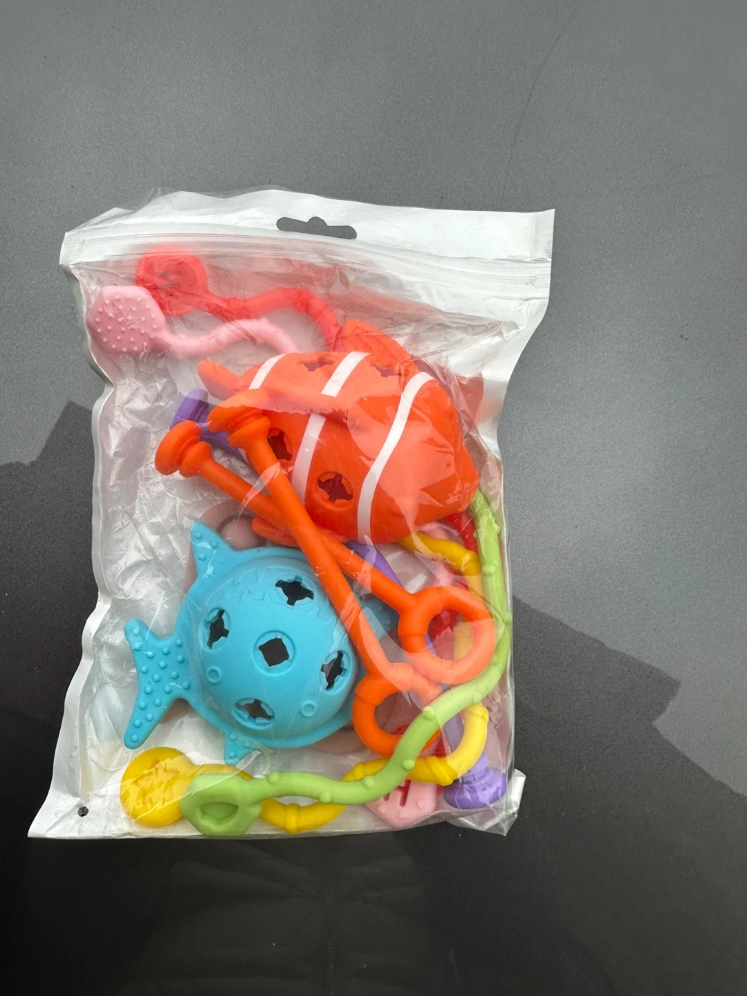 This set includes colourful teething toys for babies. The toys are designed in fish and clownfish shapes, perfect for little hands to grasp and chew. It's made from baby-safe materials.