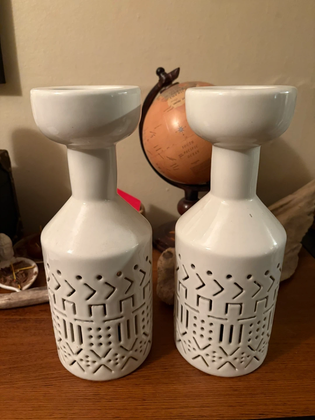 Selling a set of two white ceramic candle holders. They feature a unique cut-out geometric pattern along the base. These holders would add a stylish touch to any mantel or side table. Made of ceramic.