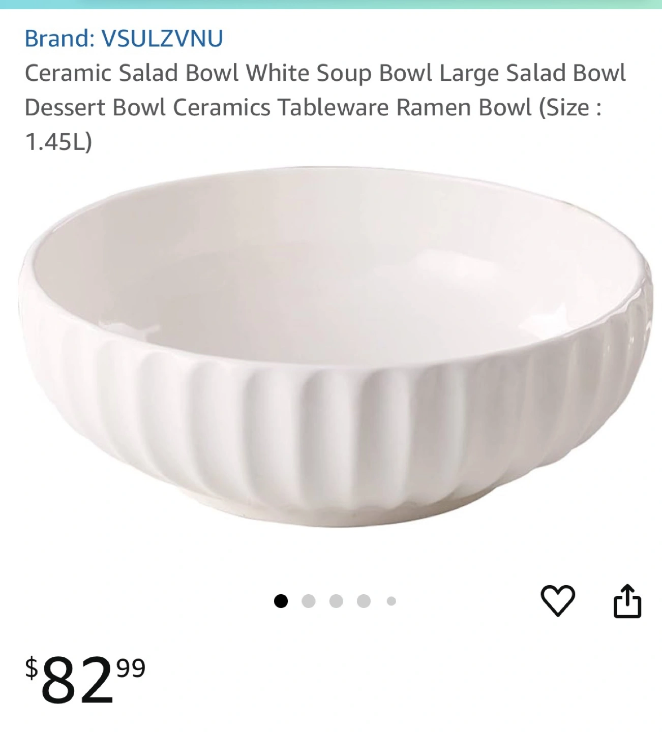 Large white ceramic bowl. Perfect for salads, soups, or desserts. Features a ribbed design. Holds 1.45L. New.