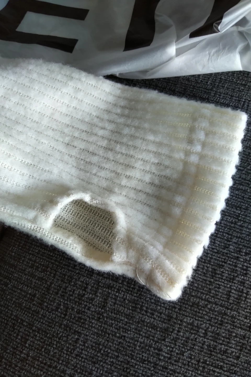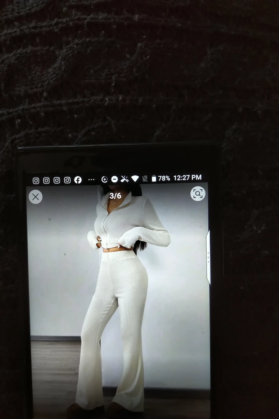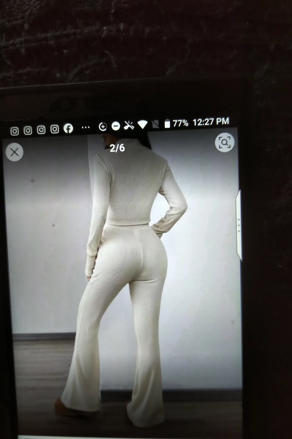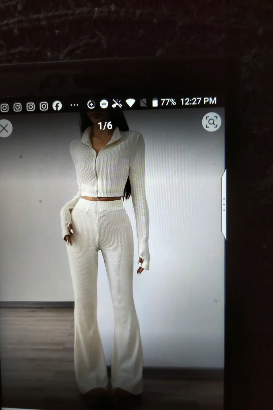 This is a cream-coloured ribbed knit two-piece set. It includes a zip-up crop top and flared pants. Made from a stretchy knit material.