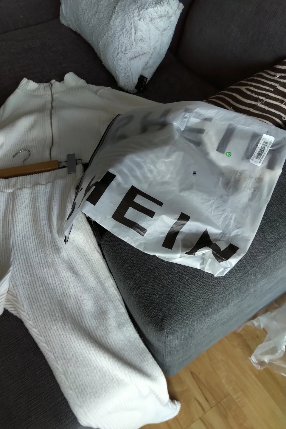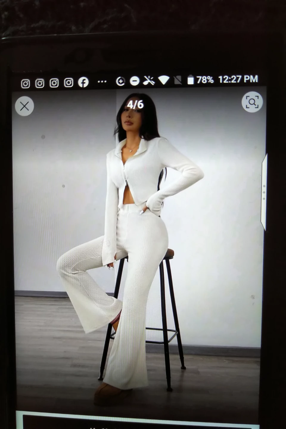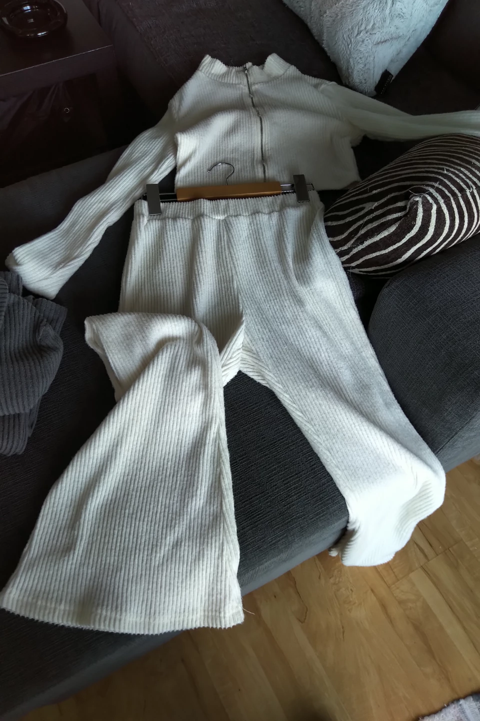 This is a cream-coloured ribbed knit two-piece set. It includes a zip-up crop top and flared pants. Made from a stretchy knit material.