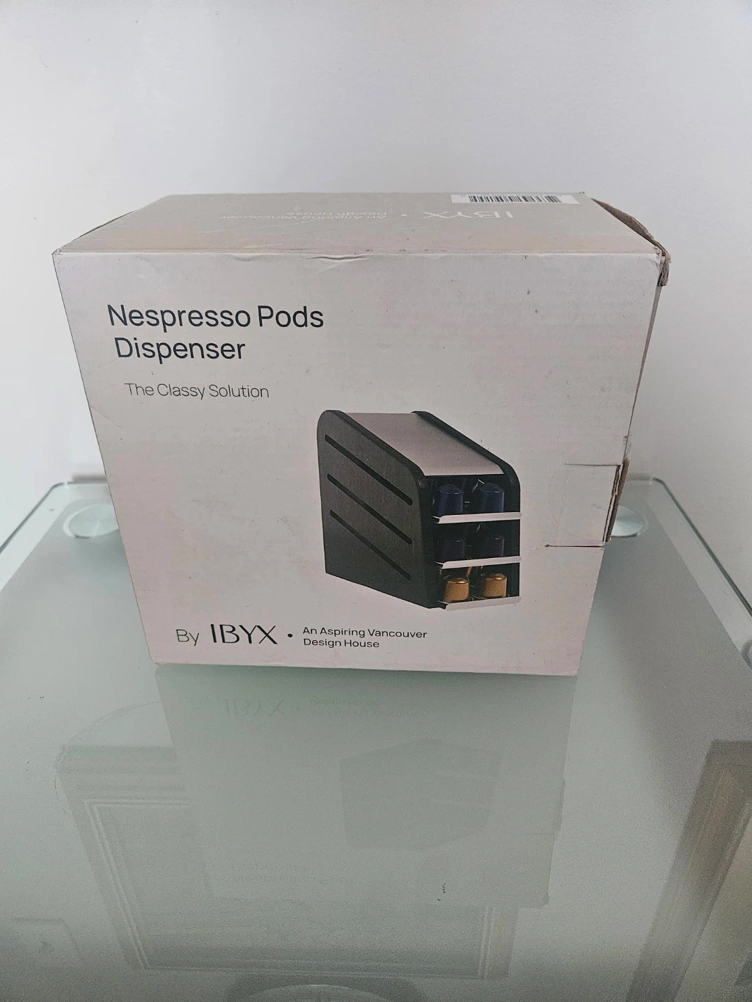 This is a new Nespresso pods dispenser by IBYX. It's a black acrylic dispenser with multiple compartments for organizing your pods. It's designed as a classy solution for your coffee station. It's suitable for anyone who enjoys Nespresso pods and wants to keep them tidy.