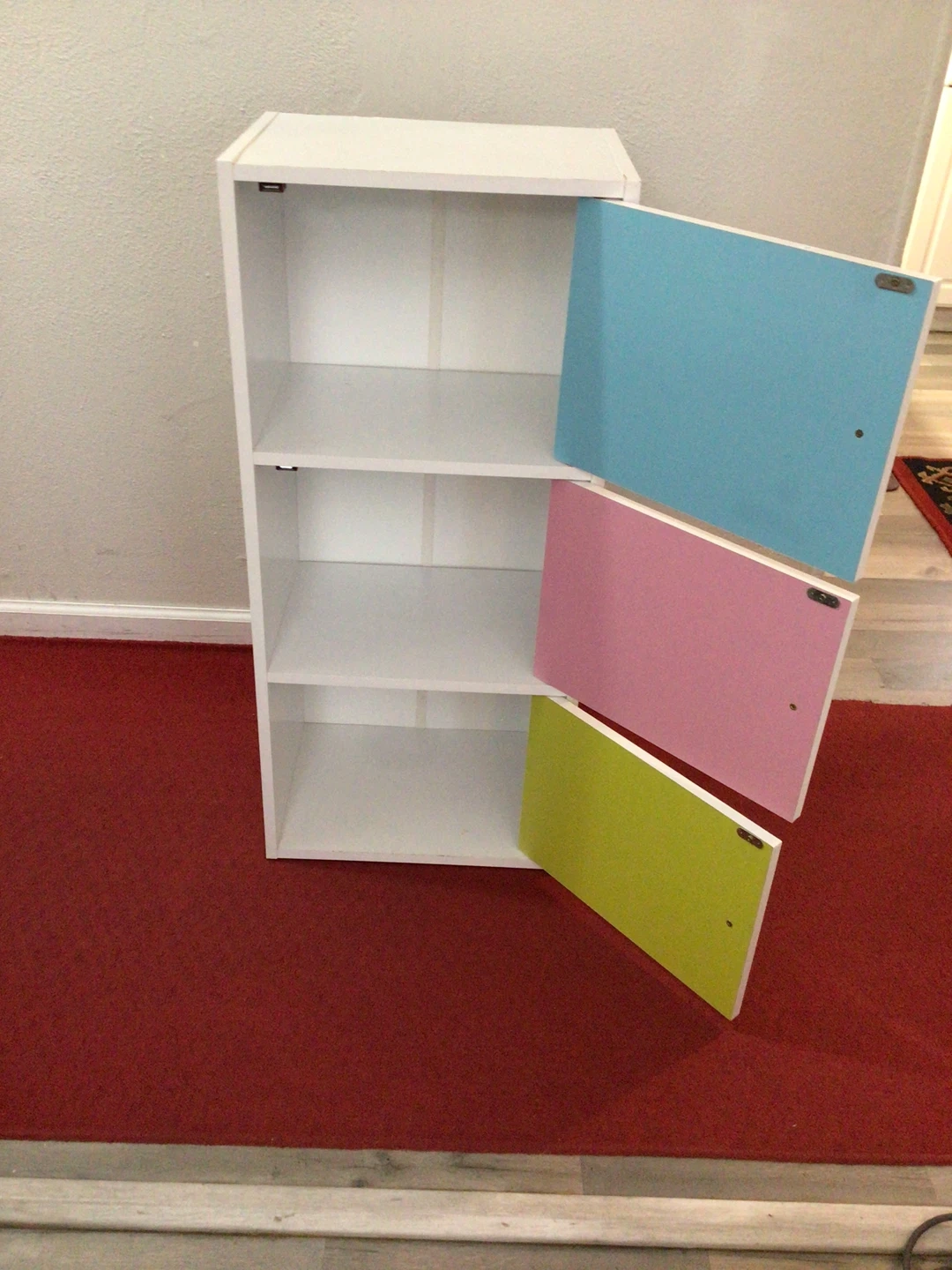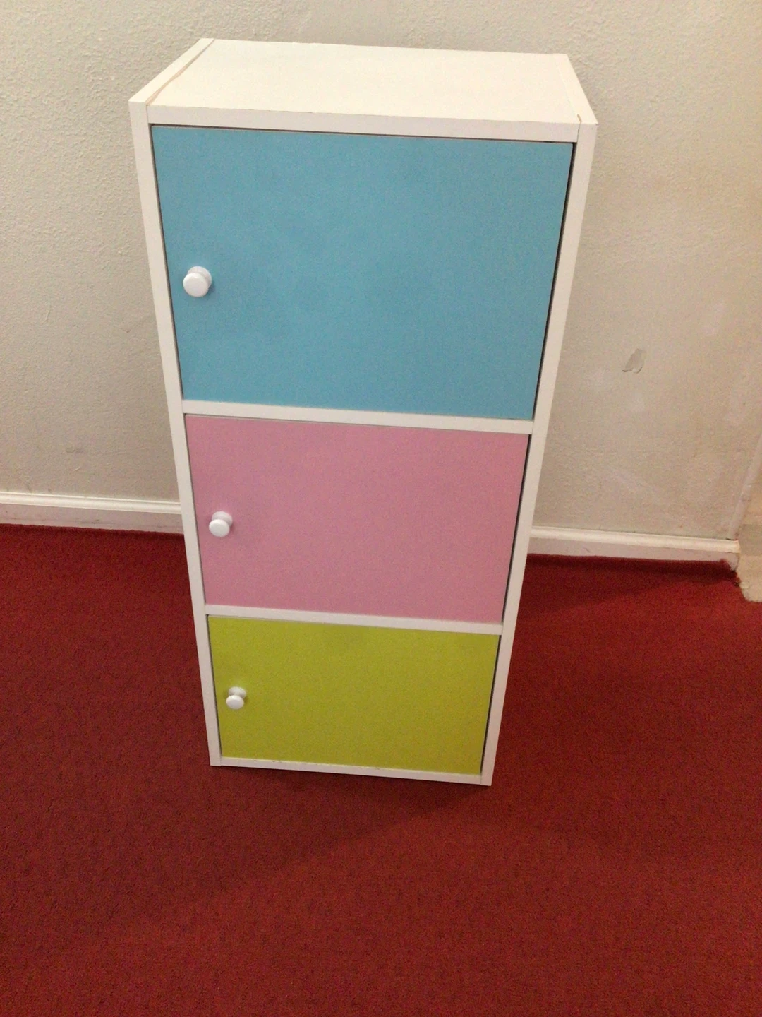 White 3-cube storage unit. Features colorful doors in blue, pink, and green. Perfect for organizing small items or displaying decor. Dimensions are 16x12 height is 36 inches