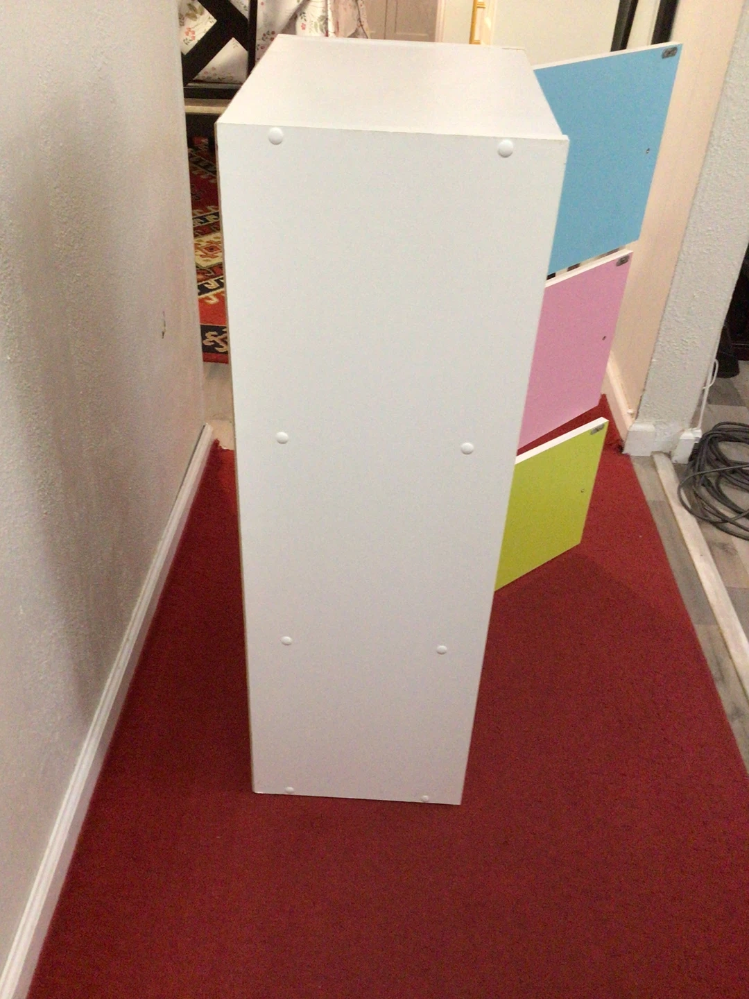 White 3-cube storage unit. Features colorful doors in blue, pink, and green. Perfect for organizing small items or displaying decor. Dimensions are 16x12 height is 36 inches