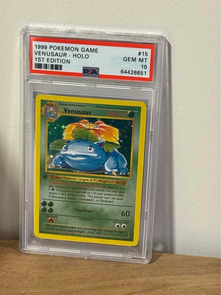 Decorative replica display piece featuring artwork inspired by the classic Pokémon Venusaur design. This is a novelty display replica only and is not an authentic graded card. It is intended strictly for decorative purposes. The card is sealed in a protective hard plastic display case, making it perfect for: Game room decor, Office shelves, Pokémon-themed setups, Gifts for fans, Nostalgic display pieces. Classic Venusaur Base Set style artwork, Decorative replica version, Non-playable / no collector resale value, Clean condition and ready to display. Great way to showcase the iconic Venusaur look without the high collector price. Pickup in Seton.