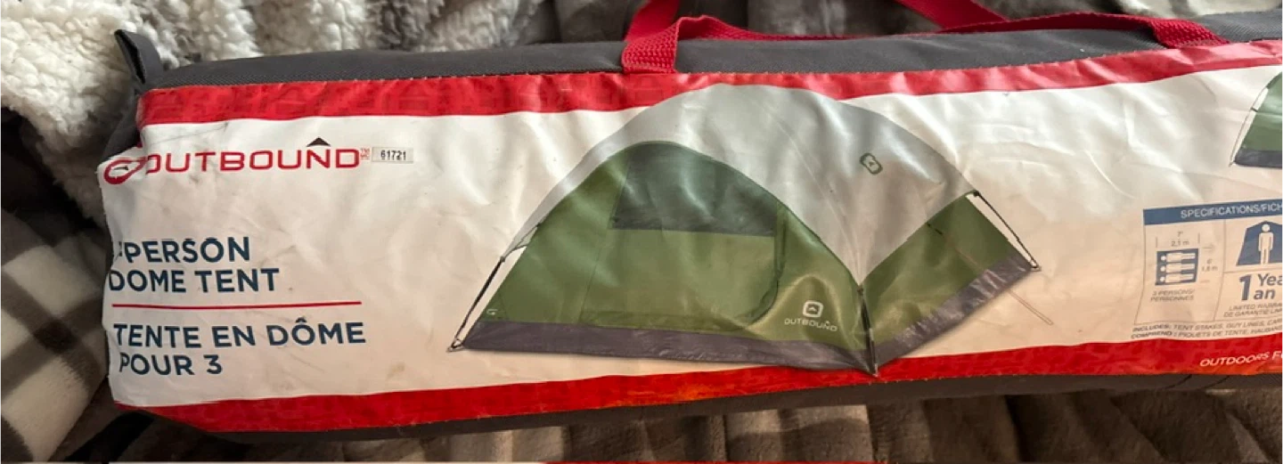 This Outbound dome tent is designed for 3 people. It features a water-repellent 600mm coated fabric and a zip window for ventilation. Includes tent stakes, guy lines, and a carry bag for easy transport.