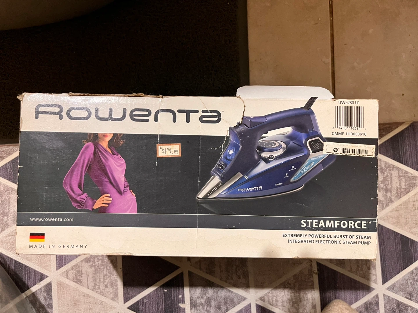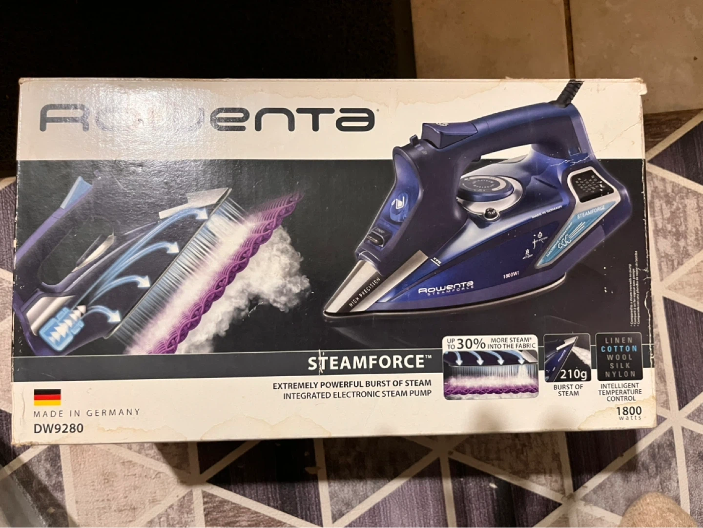 This Rowenta Steamforce iron offers an extremely powerful burst of steam. It has an integrated electronic steam pump for better performance. The iron is blue and silver with a chrome soleplate. Missing water close
