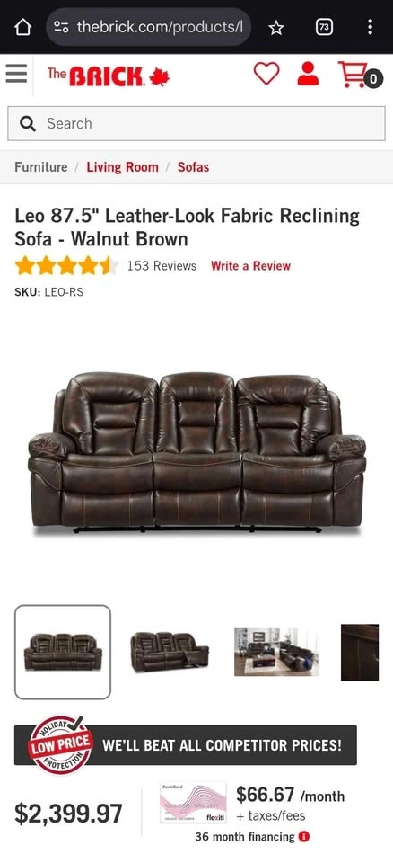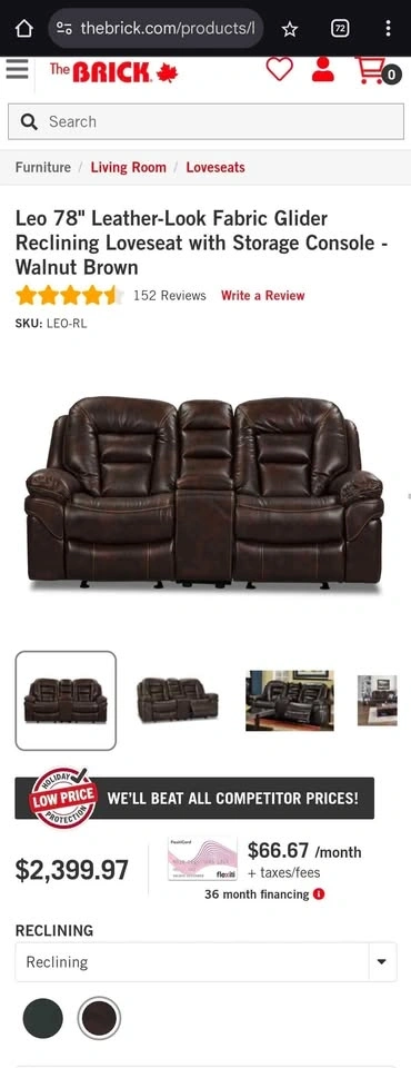 Offering a premium Leo 78" Leather-Look Glider Reclining Set from The Brick. Loveseat is in Brand new condition, I only used the sofa and bought the loveseat later to match (but never used it). Originally bought both for 2400 each plus tax. Both sofa and love seat recline on both sides.