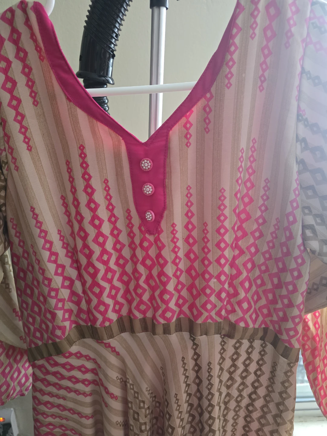 This is a women's long-sleeve dress featuring a pink, gold, and brown geometric print. It has a V-neck with decorative buttons. Made from a lightweight fabric, it's suitable for casual wear. It's a modest length and style.